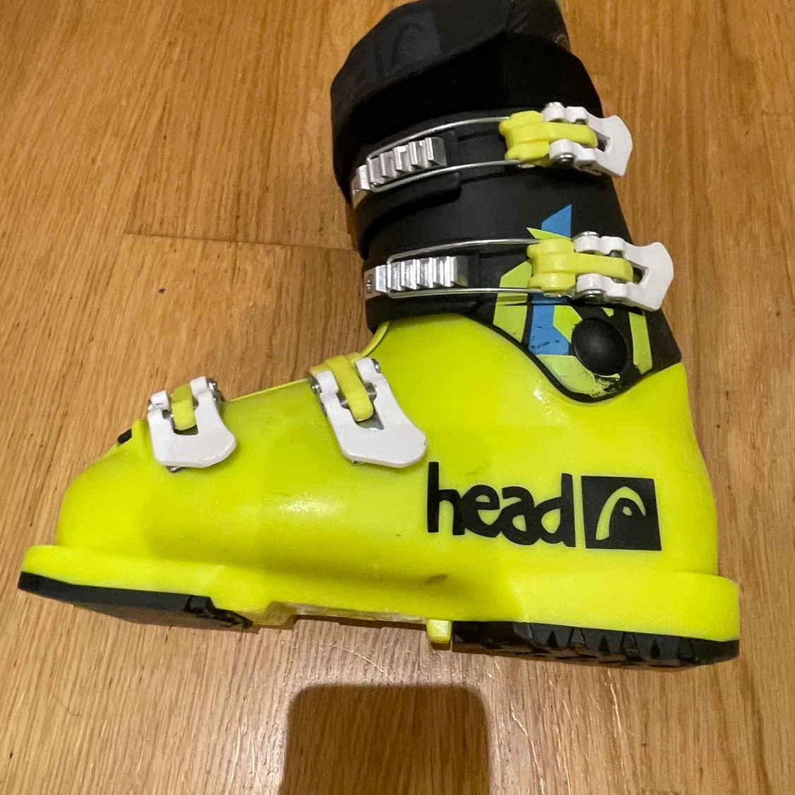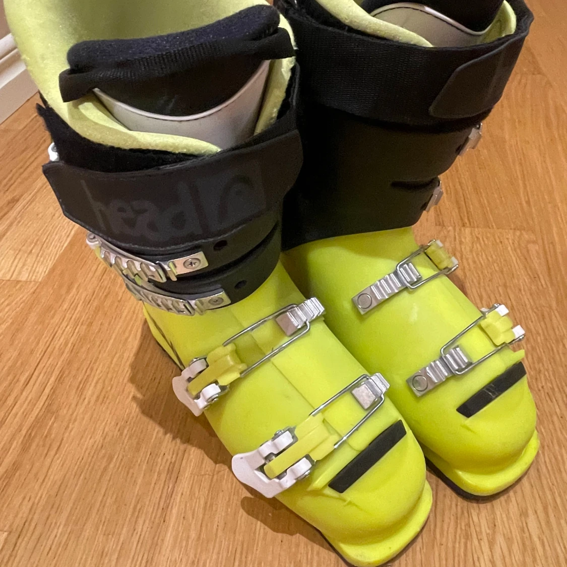 Säljer ett par coola skidpjäxor från Head i neon-gult och svart med fyra metallspännen och robust design. Pjäxorna har en tydlig logga på sidan och passar dig som vill sticka ut i backen. Perfekt för dig som gillar att åka skidor med stil.