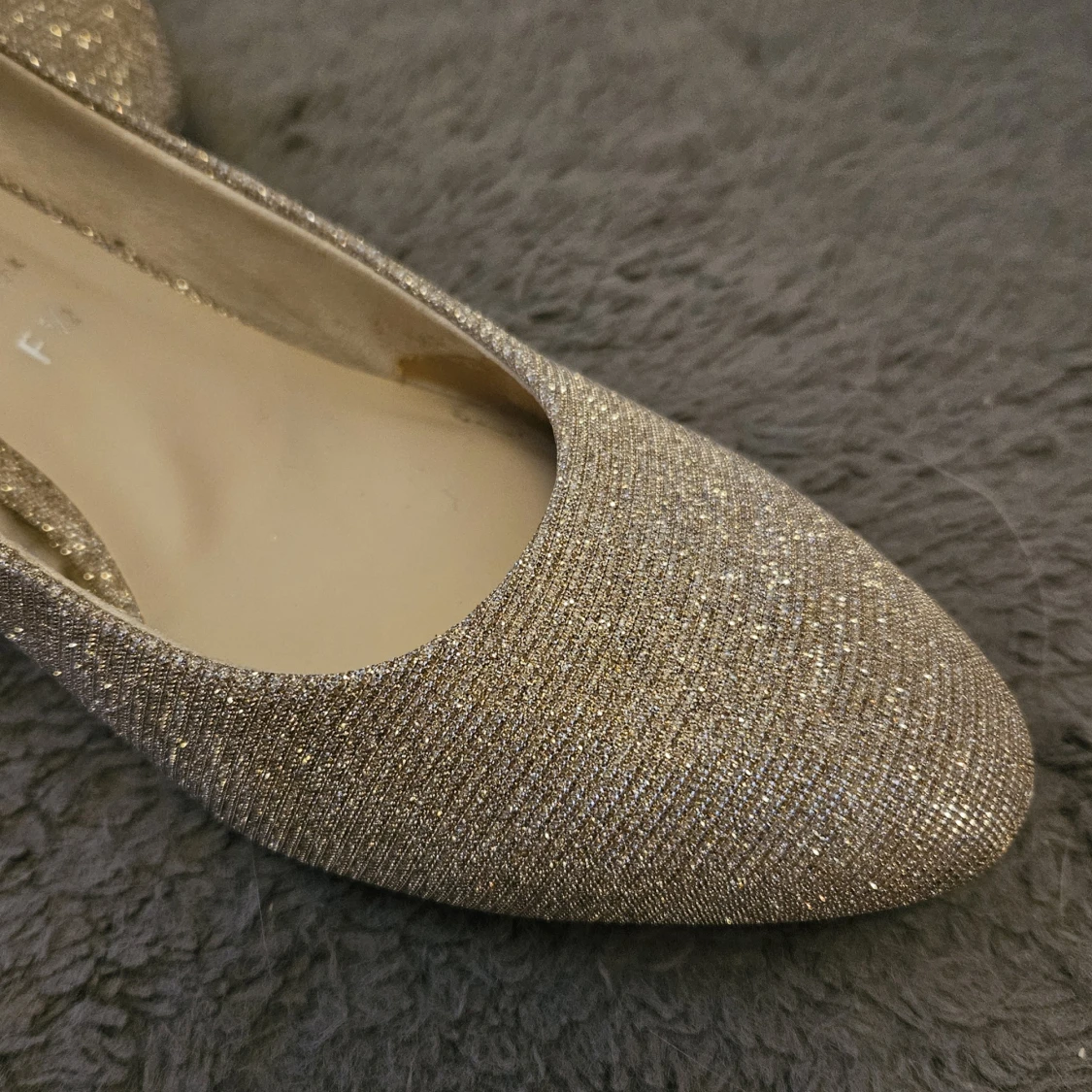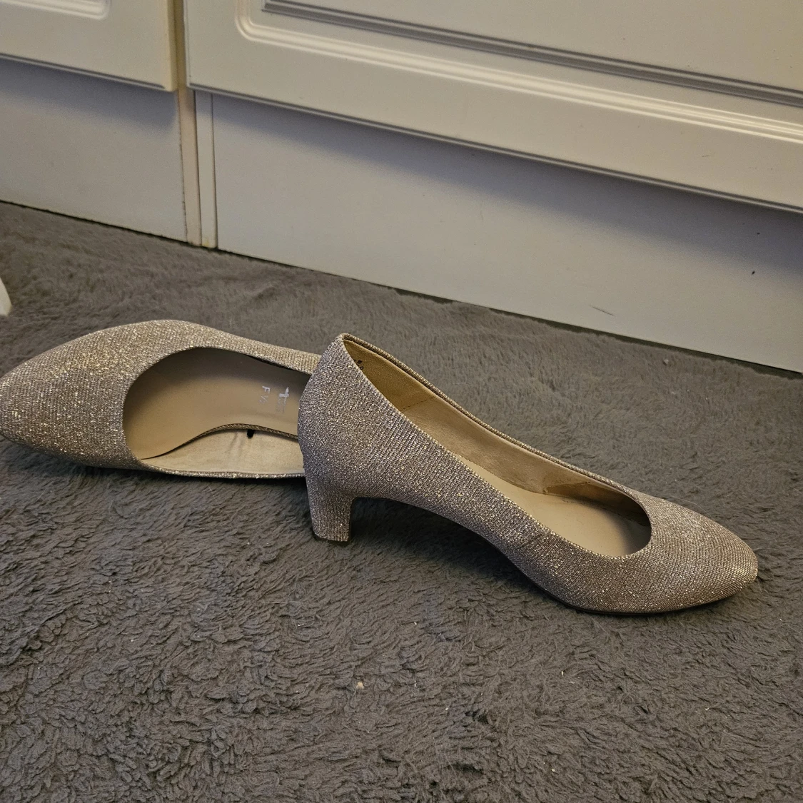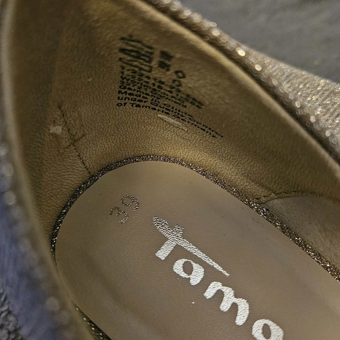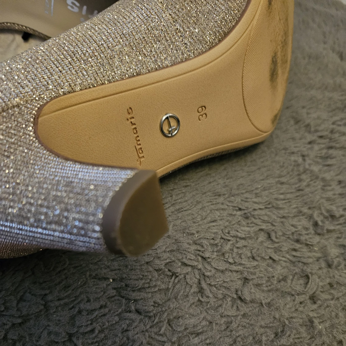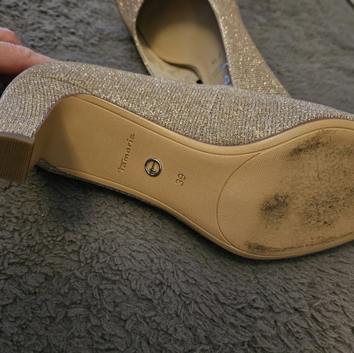 Eleganta guldiga pumps från Tamaris i storlek 39. Perfekta för festliga tillfällen eller för att piffa upp vardagsoutfiten. Bekväm klackhöjd som gör dem lätta att bära hela kvällen. Enda deffekten är sulan under. Annars finns det inget slitagepåverkan varken på klacken eller skon. Använd 2 ggr