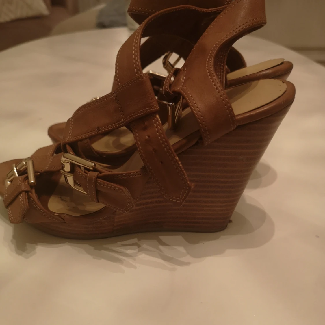 Bruna kilklackar med gulddetaljer Bruna kilklackar med gulddetaljer knappt använda