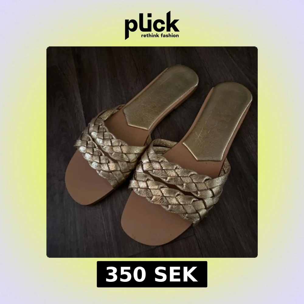 Säljer ett par snygga sandaler från Zara i guldigt syntetmaterial. Skorna har två breda flätade remmar över foten och fyrkantig tå. Perfekta för sommaren och ger en trendig touch till din outfit.