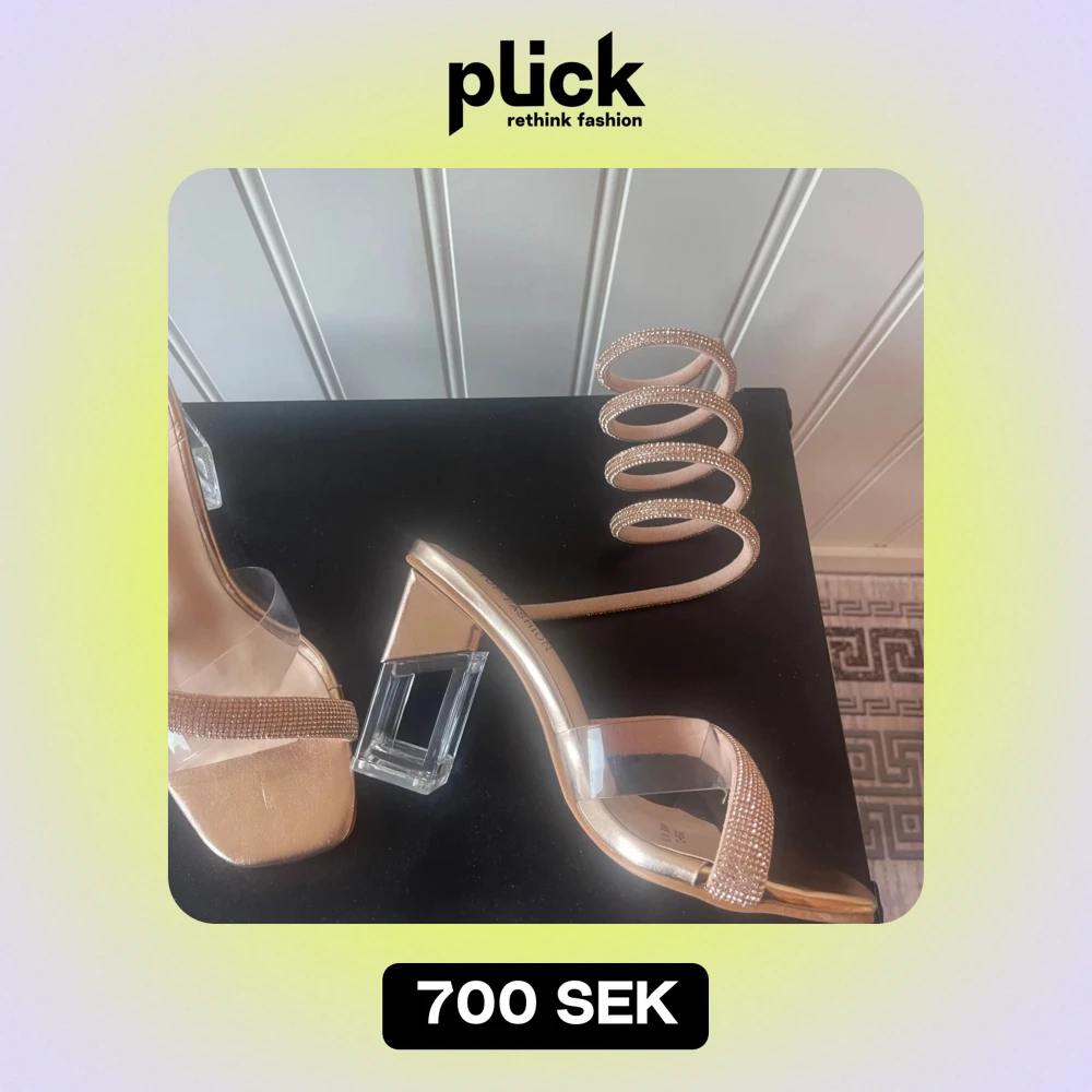 Snygga guldiga sandaler med en unik glittrig spiral som slingrar sig upp längs benet. De har en transparent klack och en glittrig rem över tårna. Perfekta för festliga tillfällen när du vill sticka ut och glänsa!