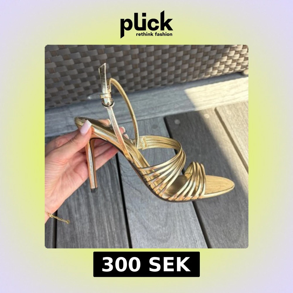 Snygga guldiga sandaler från Zara, hög klack. Skorna har öppen tå och justerbar rem runt ankeln. Andvända max 3 gånger. Sjukt snygga men de kommer inte till användning tyvärr. Tror att nypris var runt 600kr