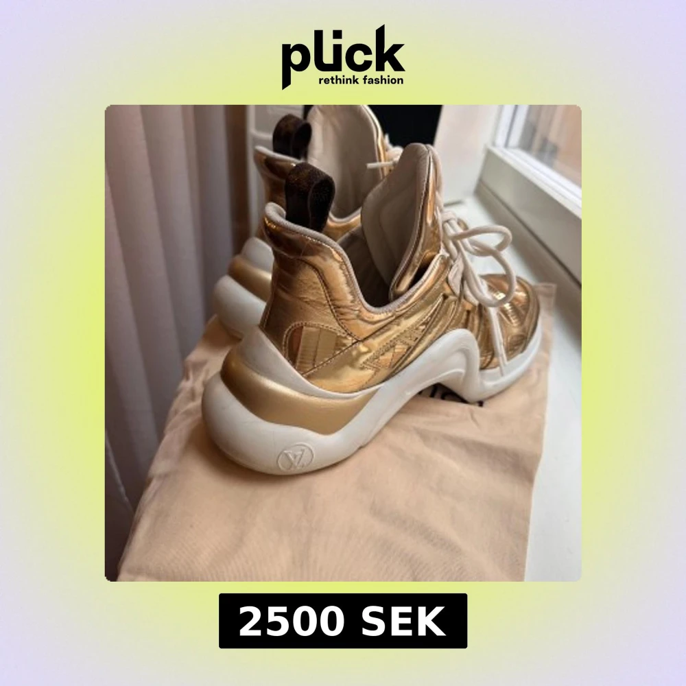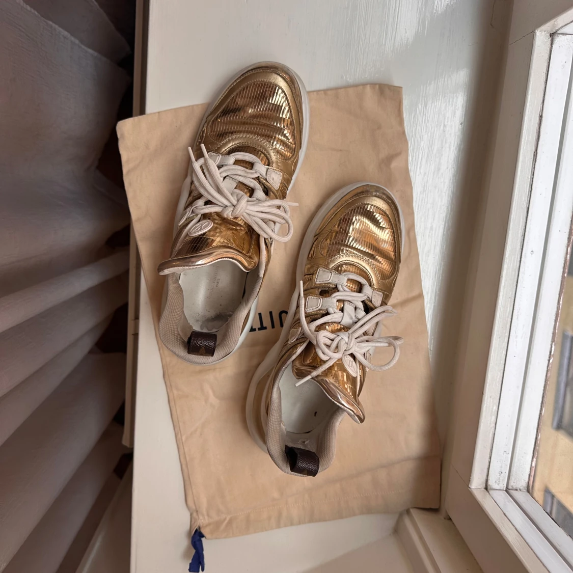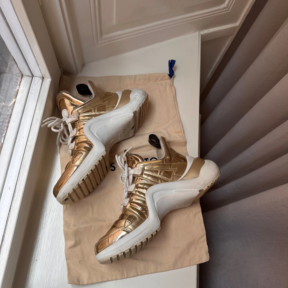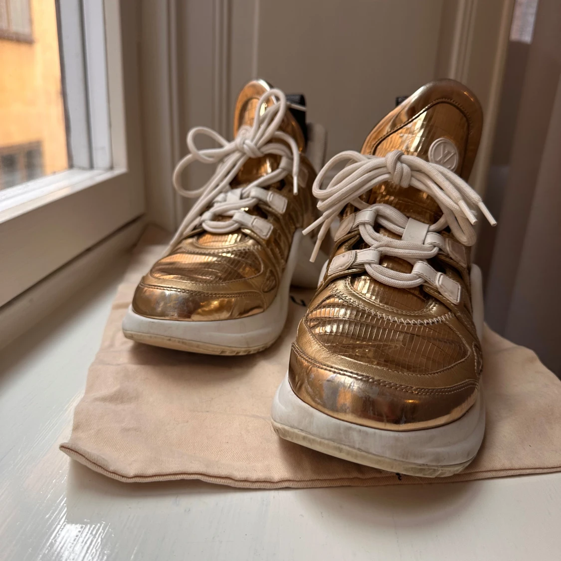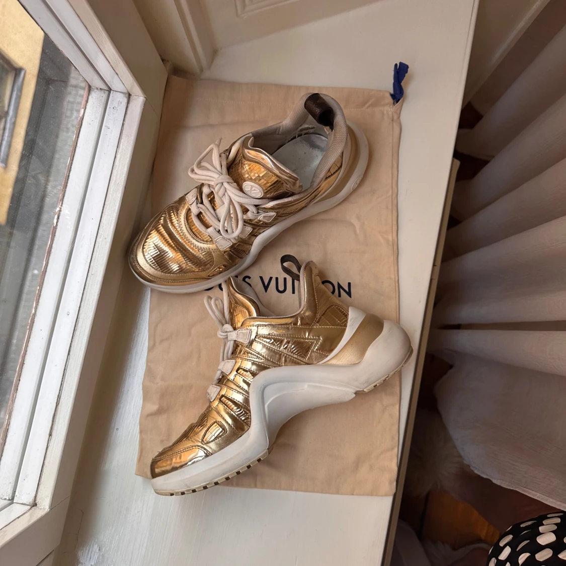 Snygga guldiga LV Archlight sneakers med vit sula och snörning. Skorna har en unik design med hög sula och detaljer i guld. Perfekta för att ge en glittrig touch till din outfit.