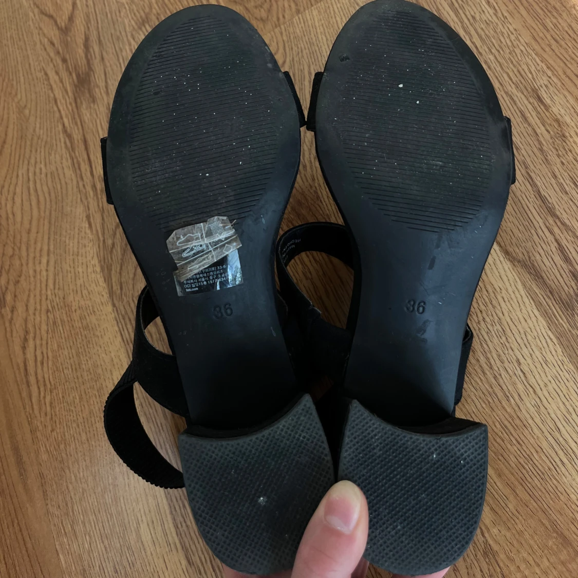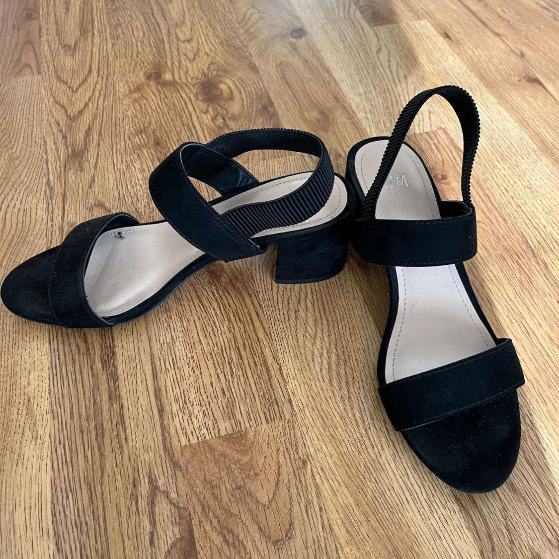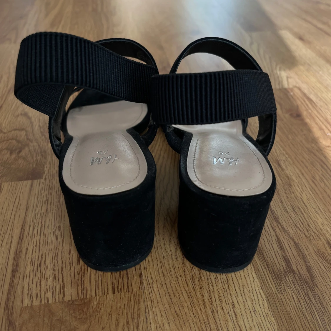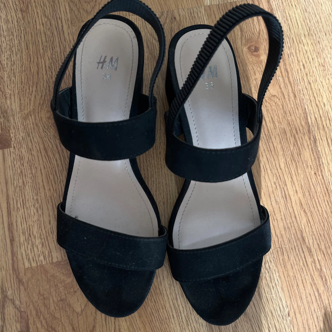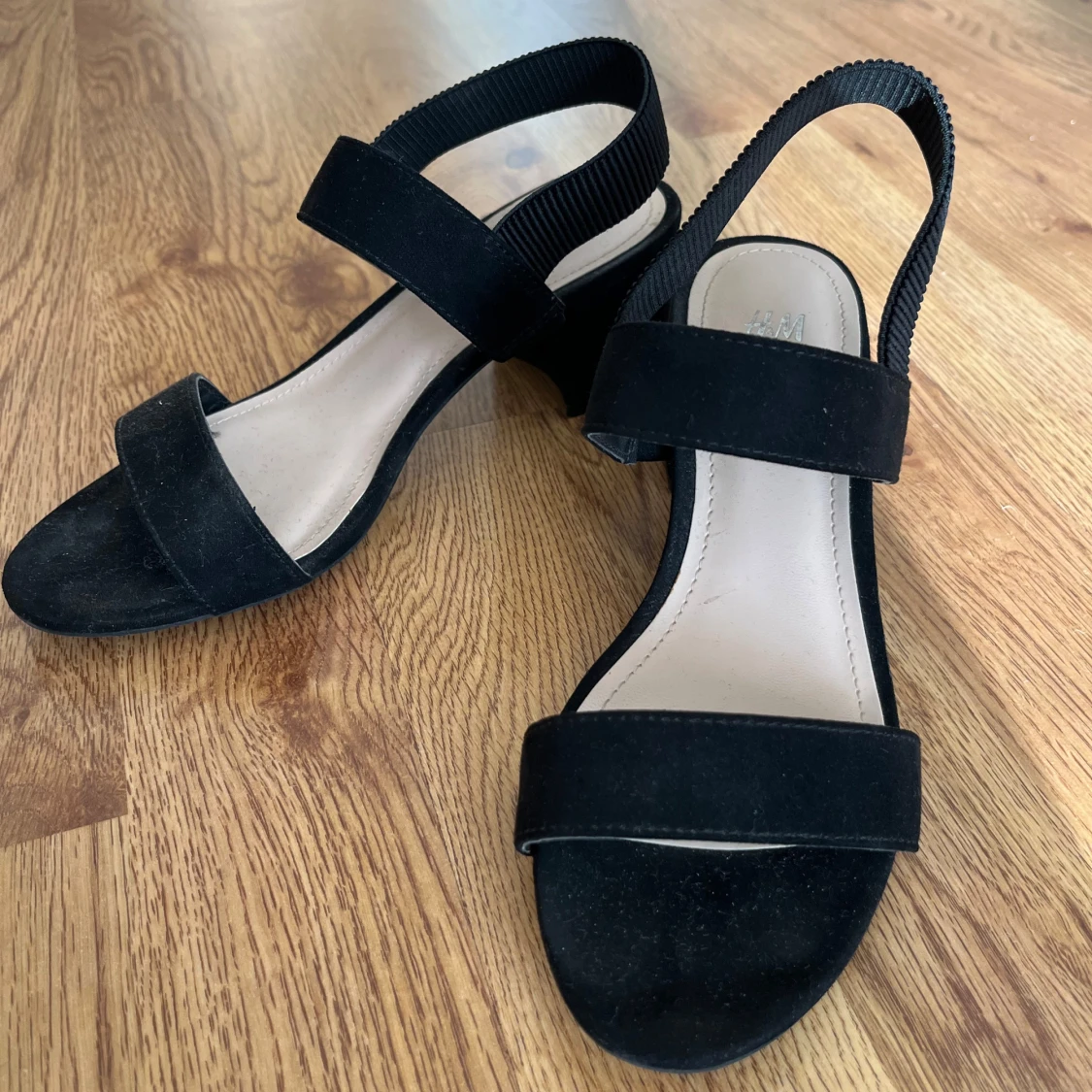Eleganta svarta sandaletter från H&M i storlek 36. Mockaimmitation. Remmar över foten och ribbad resår runt hälen. Foder och innersulor i läderimmitation samt gummisulor. Perfekta för både vardag och fest. Bekväm modell med resårband. Klackhöjd 6.5 cm. I fint skick.