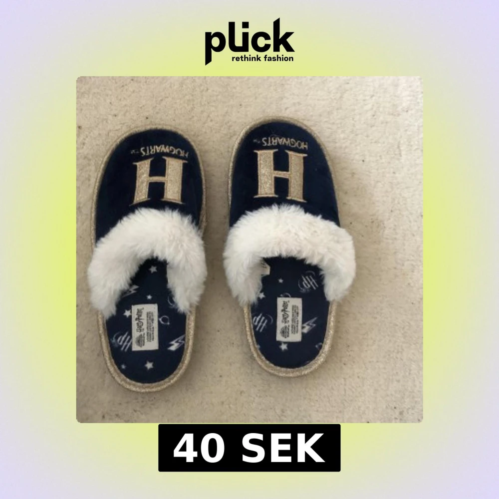 Mörkblå tofflor från Harry Potter🎩🪄 Insidan är fodrad med mjukt vitt fluff🩷 jätte sköna att att på🥰 strl: 38-39 men skulle säga att de passar bättre lite mindre storlekar☺️ använda väldigt lite och säljer pga försmå🤗 ‼️pris kan diskuteras‼️