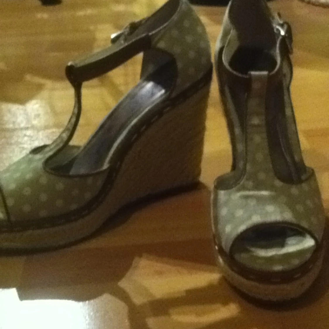 Sko med kilklack. Grå, vit prickiga med bruna detaljer och flätat rep runt klacken. Använda en gång. Köparen betalar frakten.