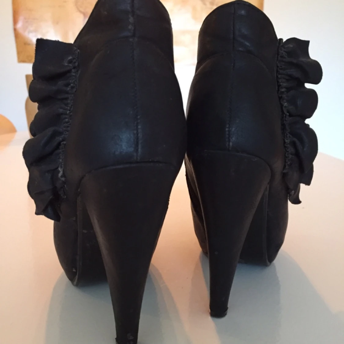 Superfina höga svarta skinnklackar med volang på sidan. Inköpta i Spanien för några år sedan för 600kr och tyvärr har jag bara använt dem två gånger då mina fötter inte tål klackar. Lite skavda vid tån men inget som syns särskilt mycket.