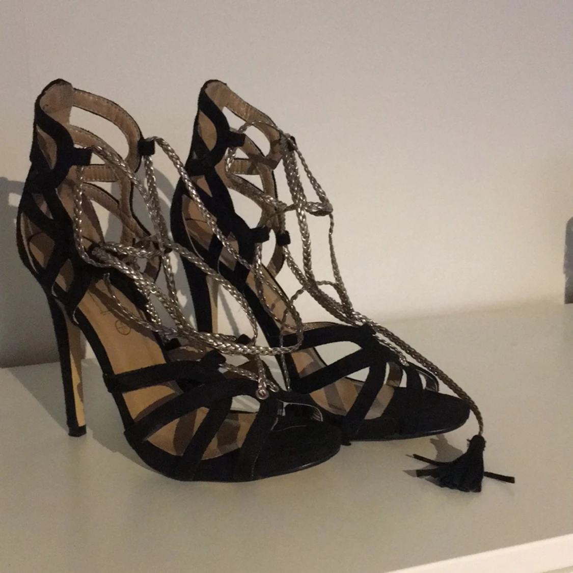 Kanonsnygga klackar i storlek 37 säljes pga av att de är för stora för mig. Snörning i guld som går att bYta ut. Klackhöjd 12 cm. Använda ca två timmar.