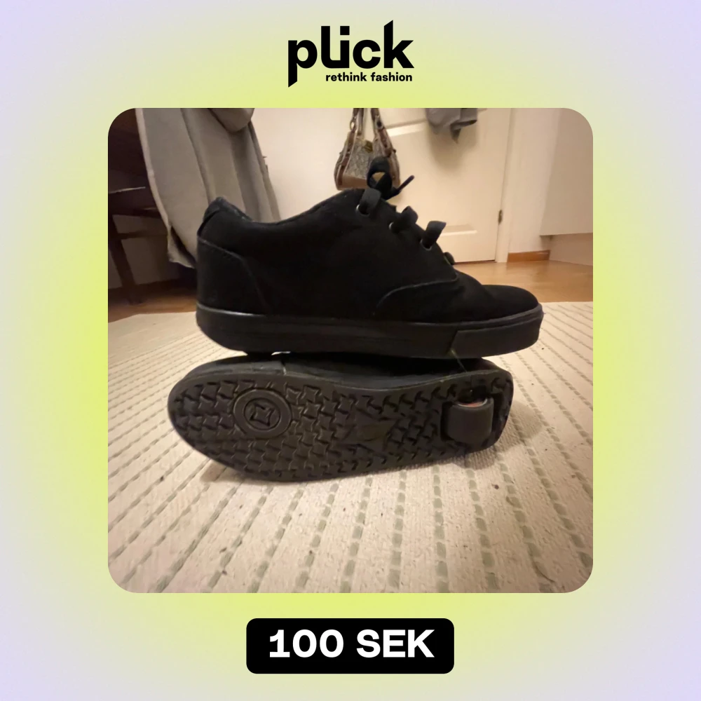 Coola svarta sneakers med inbyggda hjul i sulan. Perfekta för att rulla runt i stan eller på skolgården. Skorna har snörning och en robust sula för extra grepp när du inte rullar. De är i bra skick och redo för nya äventyr!