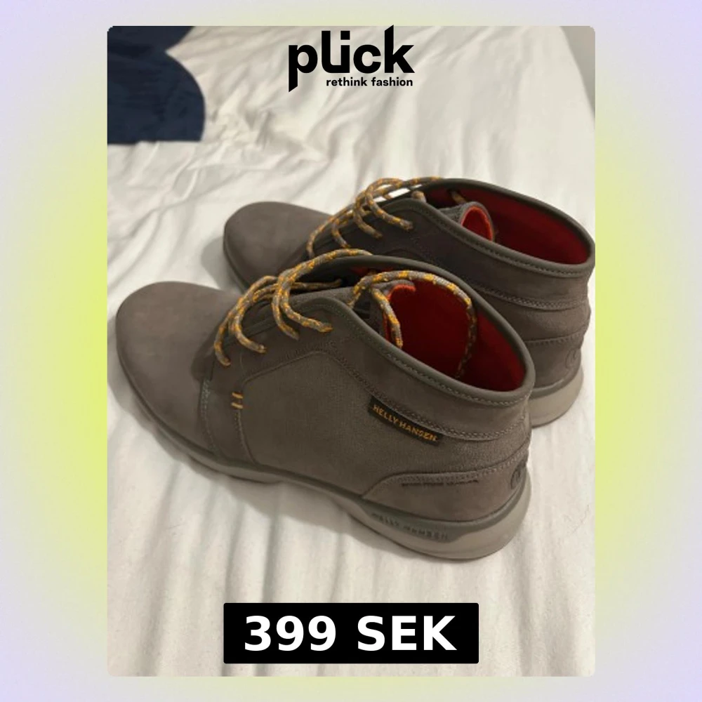 Snygga grå kängor från Helly Hansen med mockayta och orange detaljer på snörningen. Insidan är fodrad med rött tyg för extra stilpoäng. Skorna har rund tå och platt sula, perfekta för dig som gillar en clean look med lite färg.