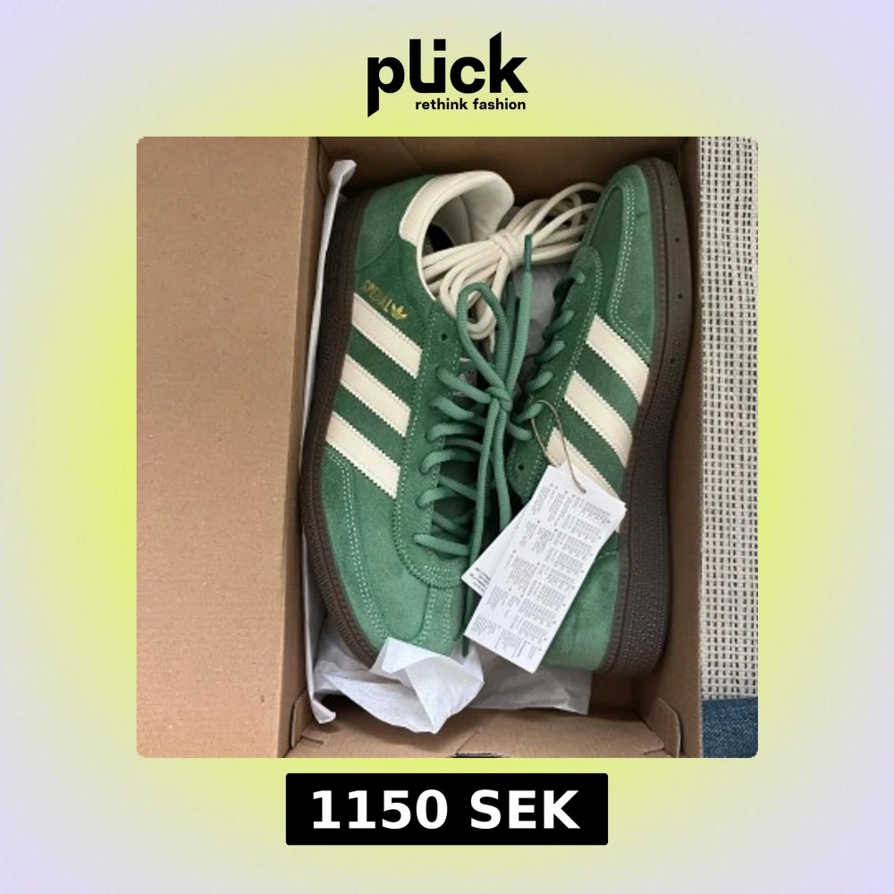 Säljer ett par dovt mellangröna Adidas Spezial sneakers med krämvita detaljer och mörkbrun sula. Skorna har klassisk retrostil, snörning och är tillverkade i mocka. Ett par extra skosnören i krämvit ingår även! Perfekta sneakers för sommaren. Skorna är helt nya och har aldrig använts, endast provat dem en gång inomhus. Lapp och skokartong finns kvar. Nypris: 1349kr (ASOS)