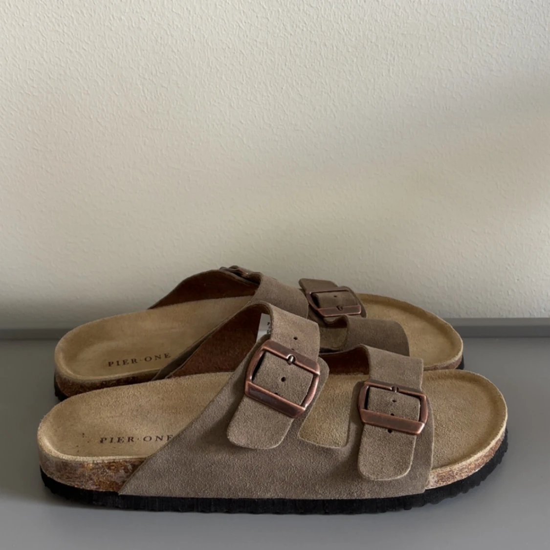 Säljer Birkenstocks liknande tofflor från Pier One som är helt nya, endast testade | Köptes för 389kr som ni kan se på bilden men säljer då dem inte kommer tillanvändning och är för första. | Storlek 42 | Skick 10/10