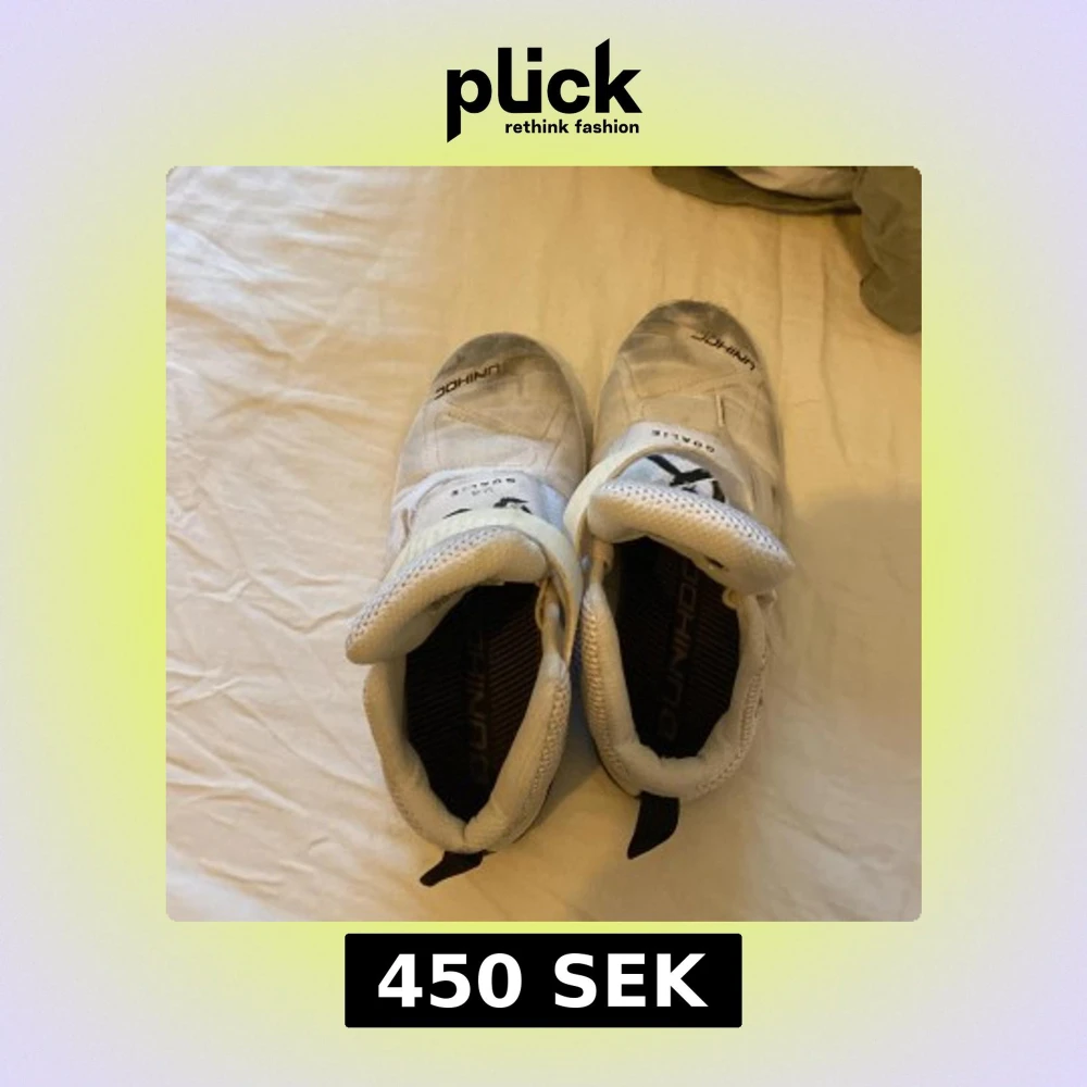 Säljer ett par vita innebandyskor från Unihoc med hög ankel och kardborreband för extra stöd. Skorna har en robust sula och är designade för målvakter. Perfekta för inomhusbruk och ger bra grepp på planen. De är använda i en halv säsong en röd fläck på sidan av vänstra skon. Kan sänka pris det är bara att kontakta hyfsat bra skick