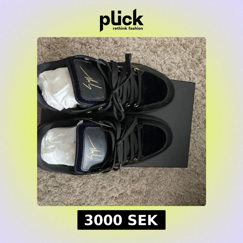 Säljer ett par svarta sneakers från Giuseppe Zanotti med guldfärgade detaljer och signatur på plösen. Skorna har svarta snören, platt sula och en mix av blankt och matt material. Snygg och lyxig design som sticker ut. Använd 5 eller 6 gånger. Box och dustbag ingår