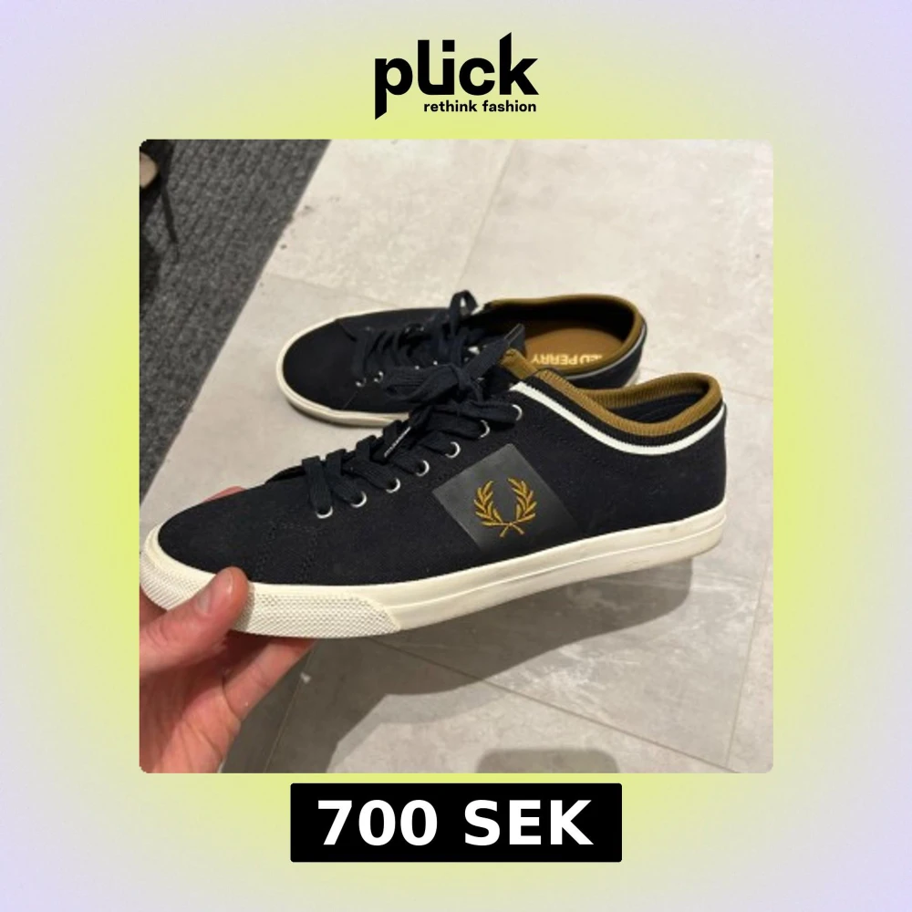 Säljer ett par mörkblå Fred Perry sneakers med vit sula och gulddetaljer vid kragen. Skorna har snörning och är tillverkade i textil med Fred Perrys ikoniska lagerkrans på sidan. Perfekta för en stilren och sportig look. Nypris 1799:-