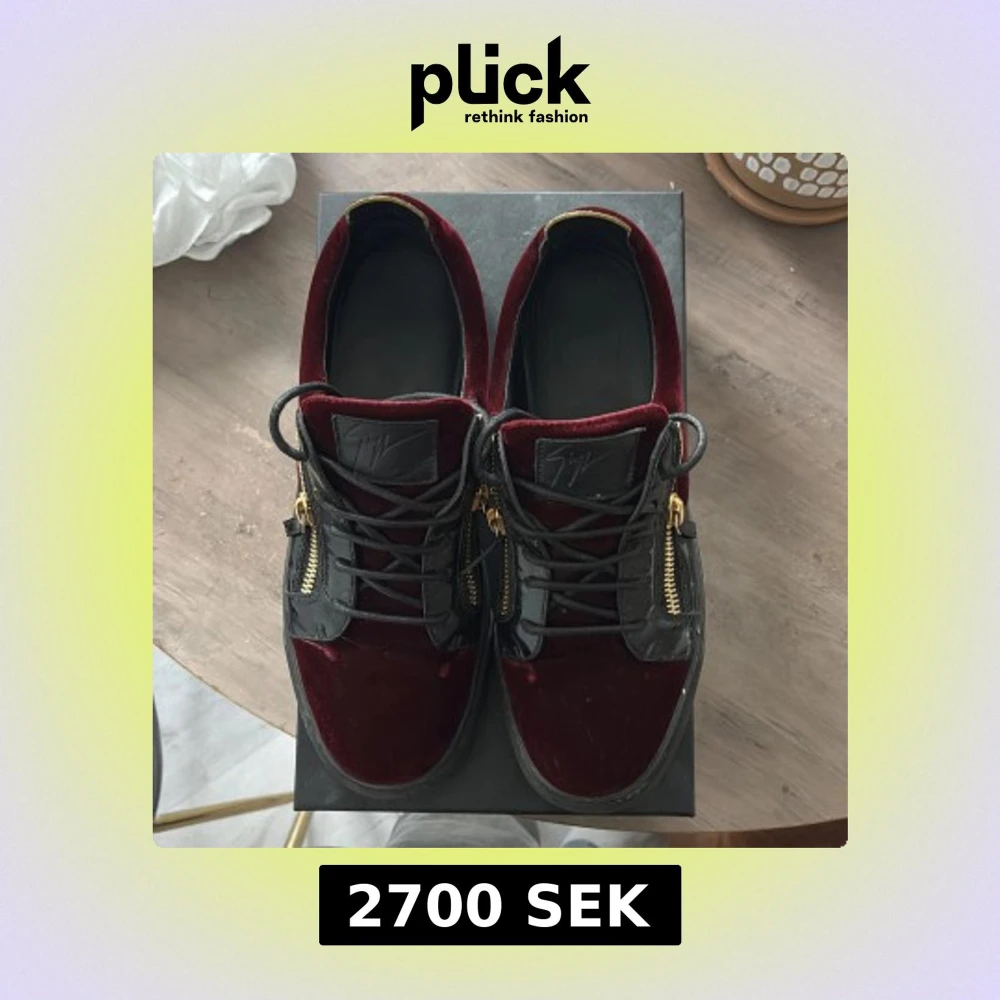 Säljer ett par exklusiva sneakers från Giuseppe Zanotti i vinröd sammet med svarta skinnpaneler. Skorna har guldfärgade dragkedjor på sidorna, snörning och platt sula. Perfekt för dig som vill sticka ut med lyxiga detaljer. Ps ena skosnöret är lite trasigt