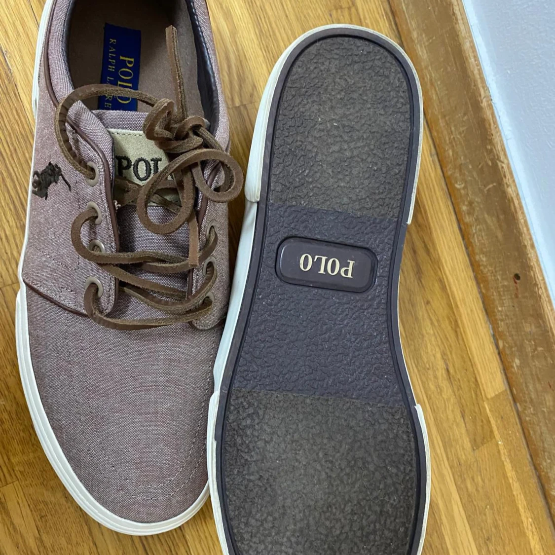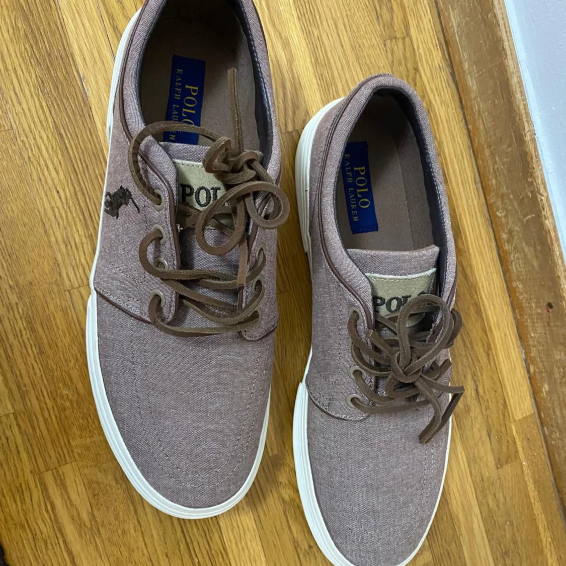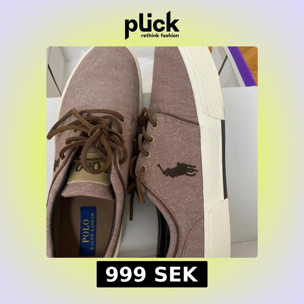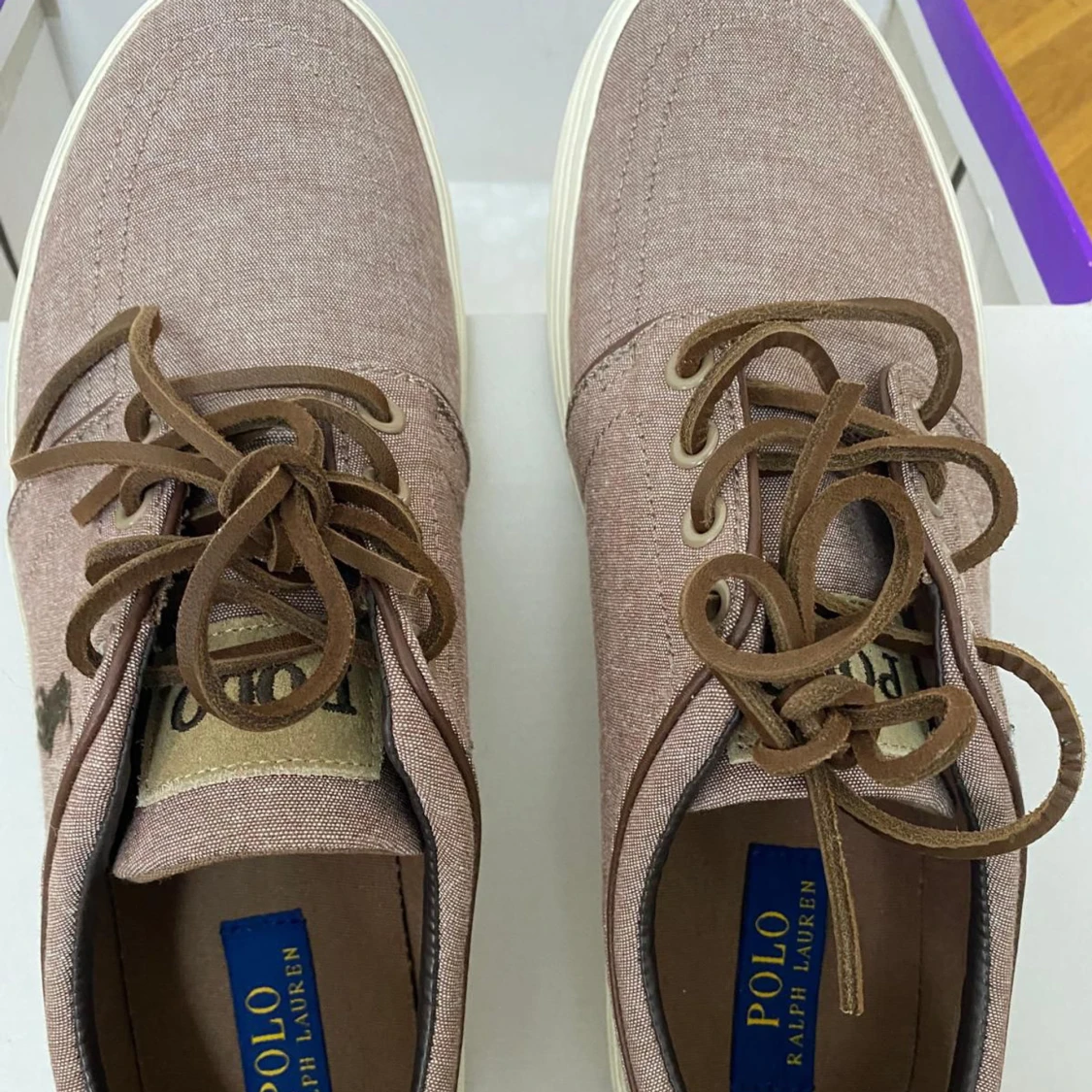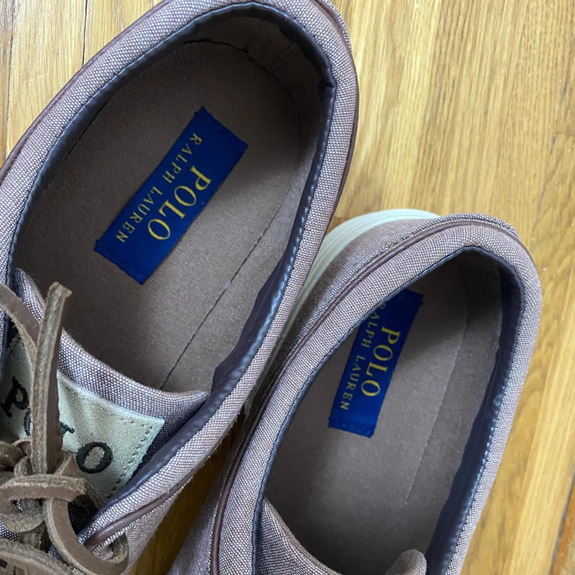 Snygga bruna sneakers från Polo Ralph Lauren med klassisk logga på sidan. Skorna har snörning, vit platt sula och är tillverkade i bomullstyg med bruna mockaliknande skosnören. Perfekta för en avslappnad och stilren look nu i höst! Pris kan diskuteras!💕