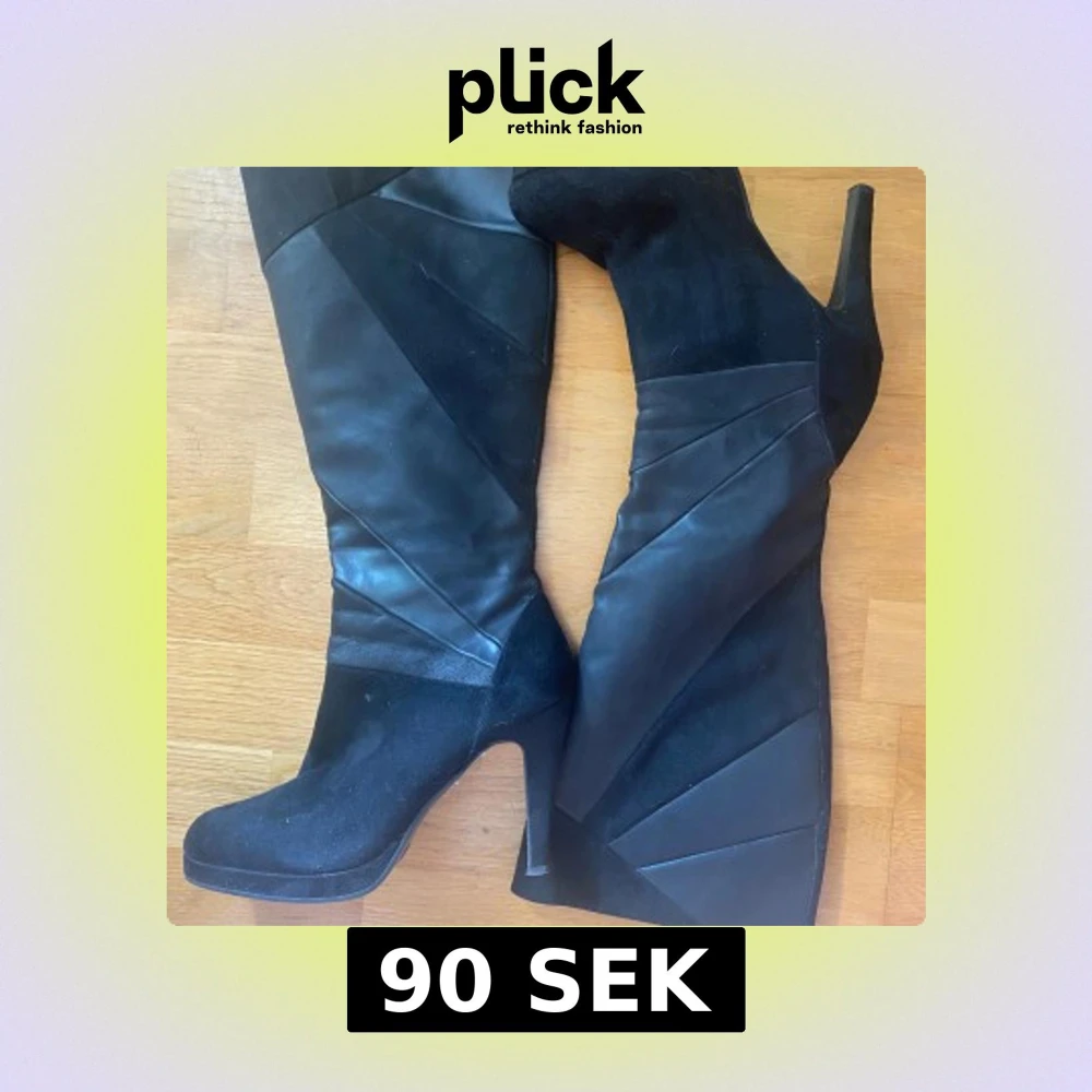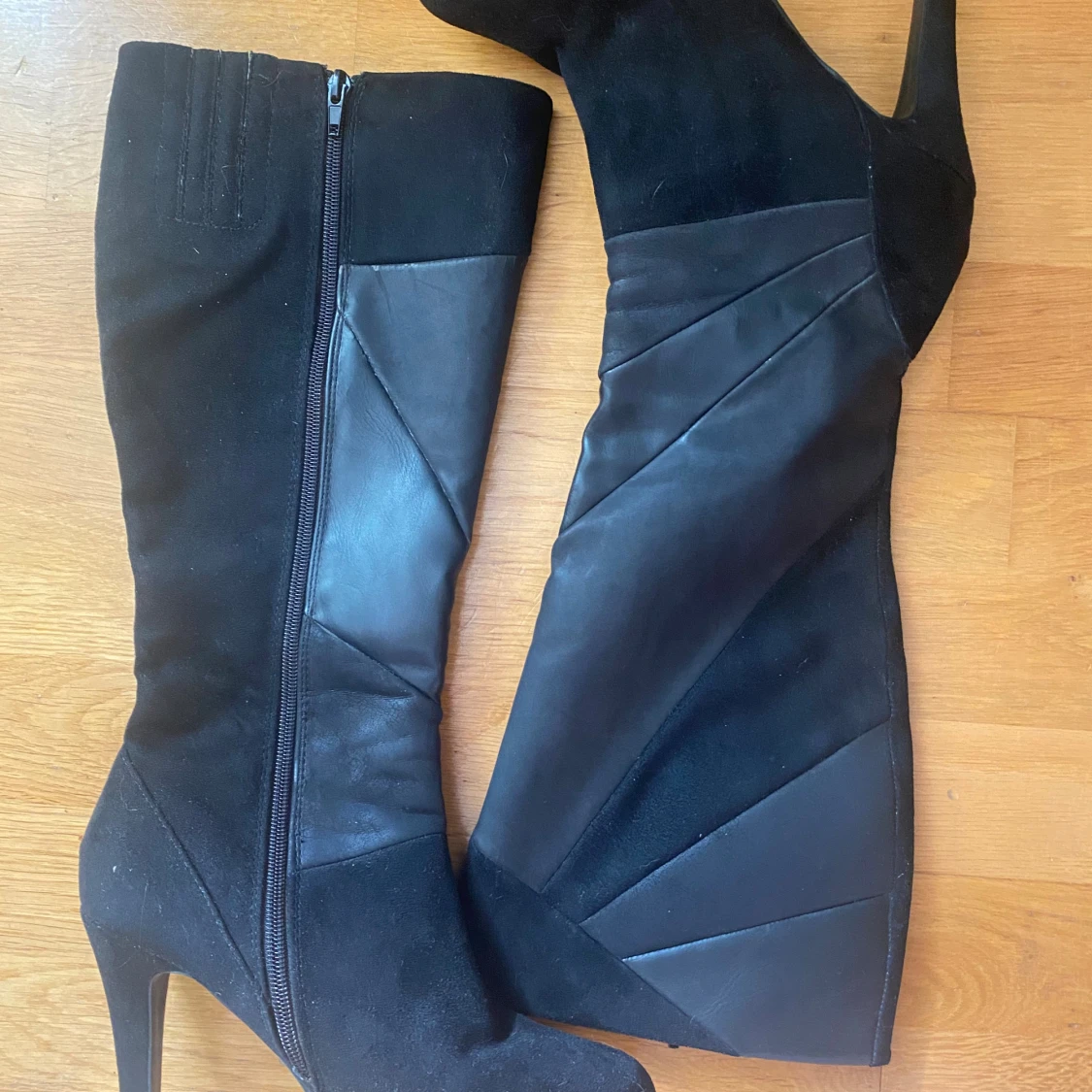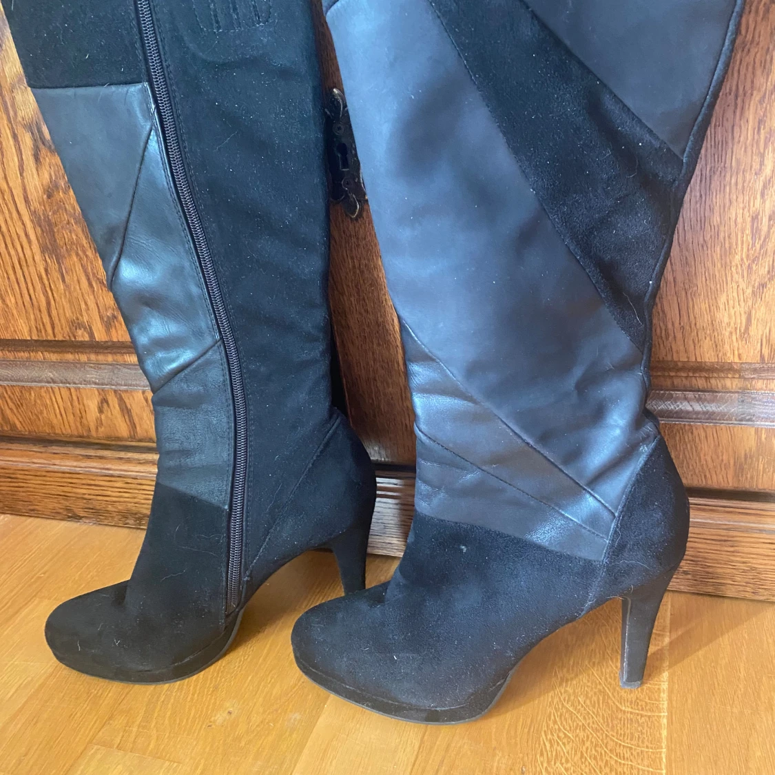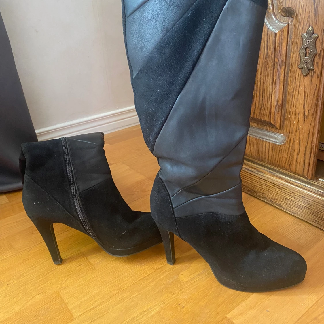 Snygga svarta stövlar med hög klack och plattform. De har en cool geometrisk design med paneler i mocka och skinn, samt dragkedja på insidan för enkel på- och avtagning. Rund tå och stilren look som passar till många outfits.❤️