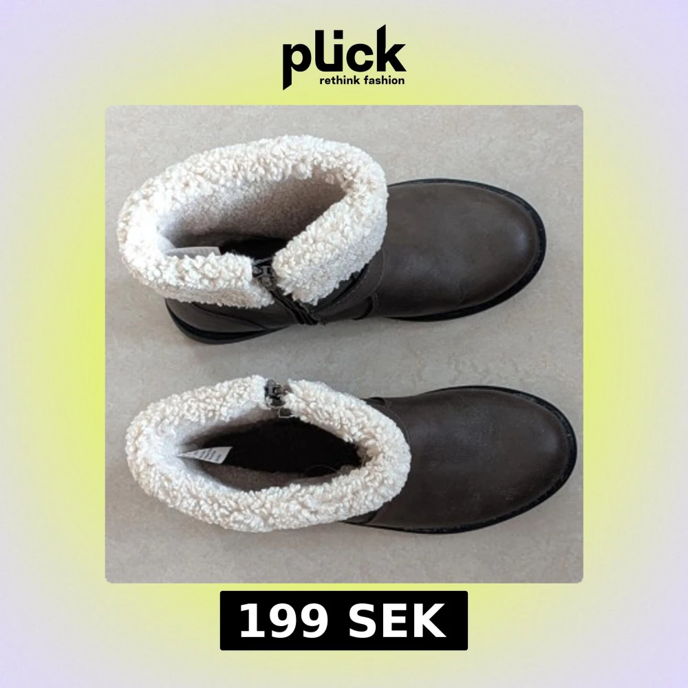 Säljer ett par bruna boots från H&M i storlek 36. De har en rund tå, platt sula och är fodrade med mjuk beige fuskpäls upptill. Bootsens ovandel är i syntetmaterial och de har en snygg spänndetalj på sidan samt dragkedja för enkel påtagning.