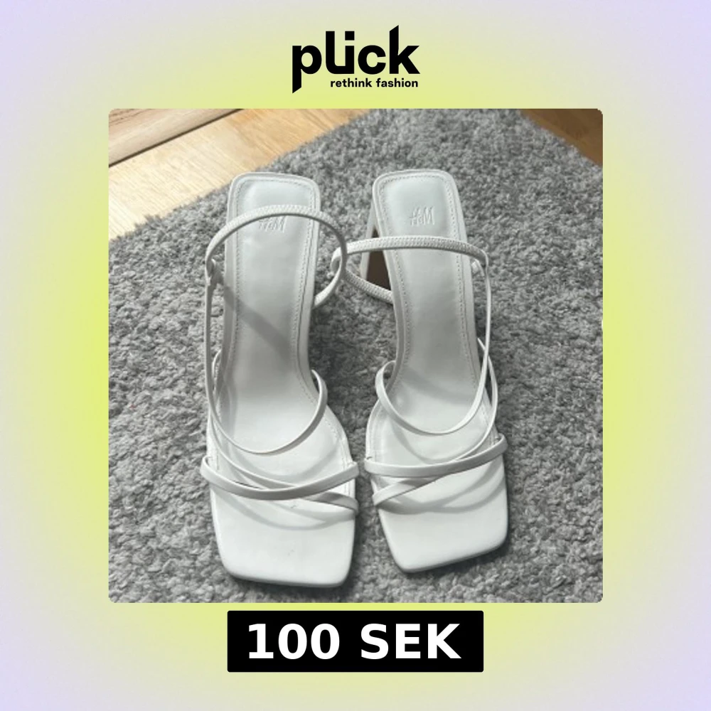 Stilrena vita sandaler från H&M med fyrkantig tå och smala remmar. Bandet bakom hålen är stretchigt vilket gör att den anpassad efter just din fot. Skorna har en hög blockklack på ca 7 cm som underlättar gång på ojämna underlag och öppen tå, perfekt för att lyfta din look. Köpta på Vinted efter en användning men har själv aldrig använt.