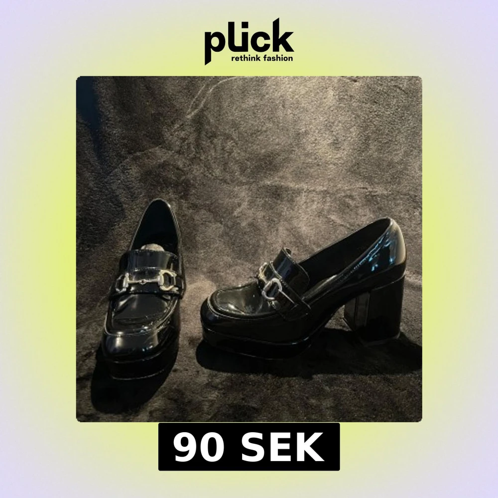 Snygga svarta loafers i lack från H&M med chunky platåsula och hög klack. Skorna har fyrkantig tå, dekorativ metallspänne framtill och en glansig finish som ger en cool retrovibe. Perfekta för dig som vill sticka ut med din stil.
