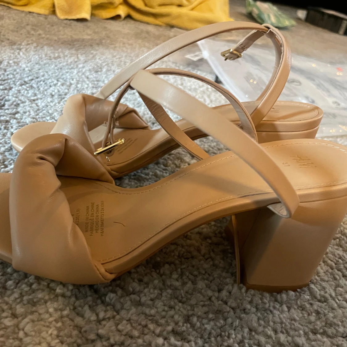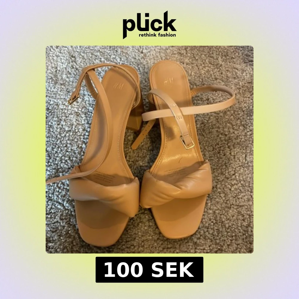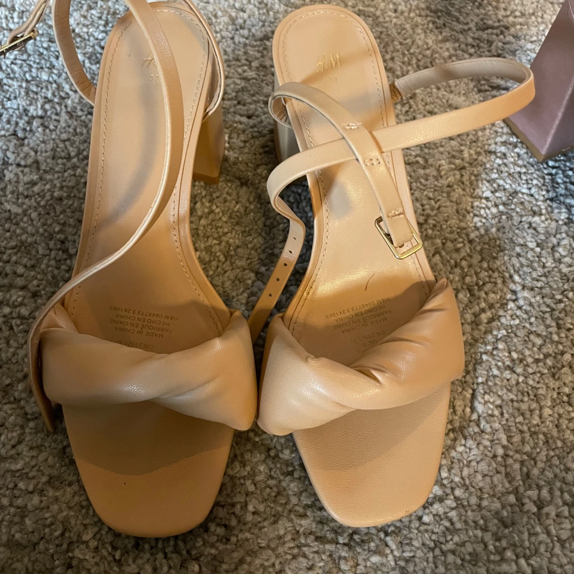 Snygga beige sandaler från H&M med fyrkantig tå och bred, twistad rem framtill. De har smala ankelremmar med guldfärgat spänne och stabil blockklack. Tillverkade i syntetmaterial med mjuk finish, perfekta för dig som gillar stilrena och trendiga skor.
