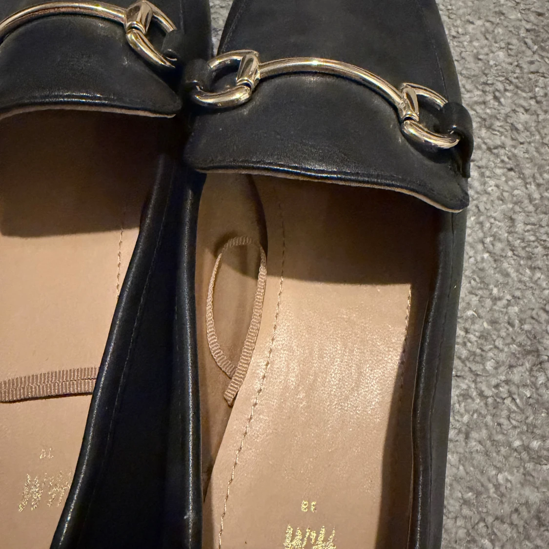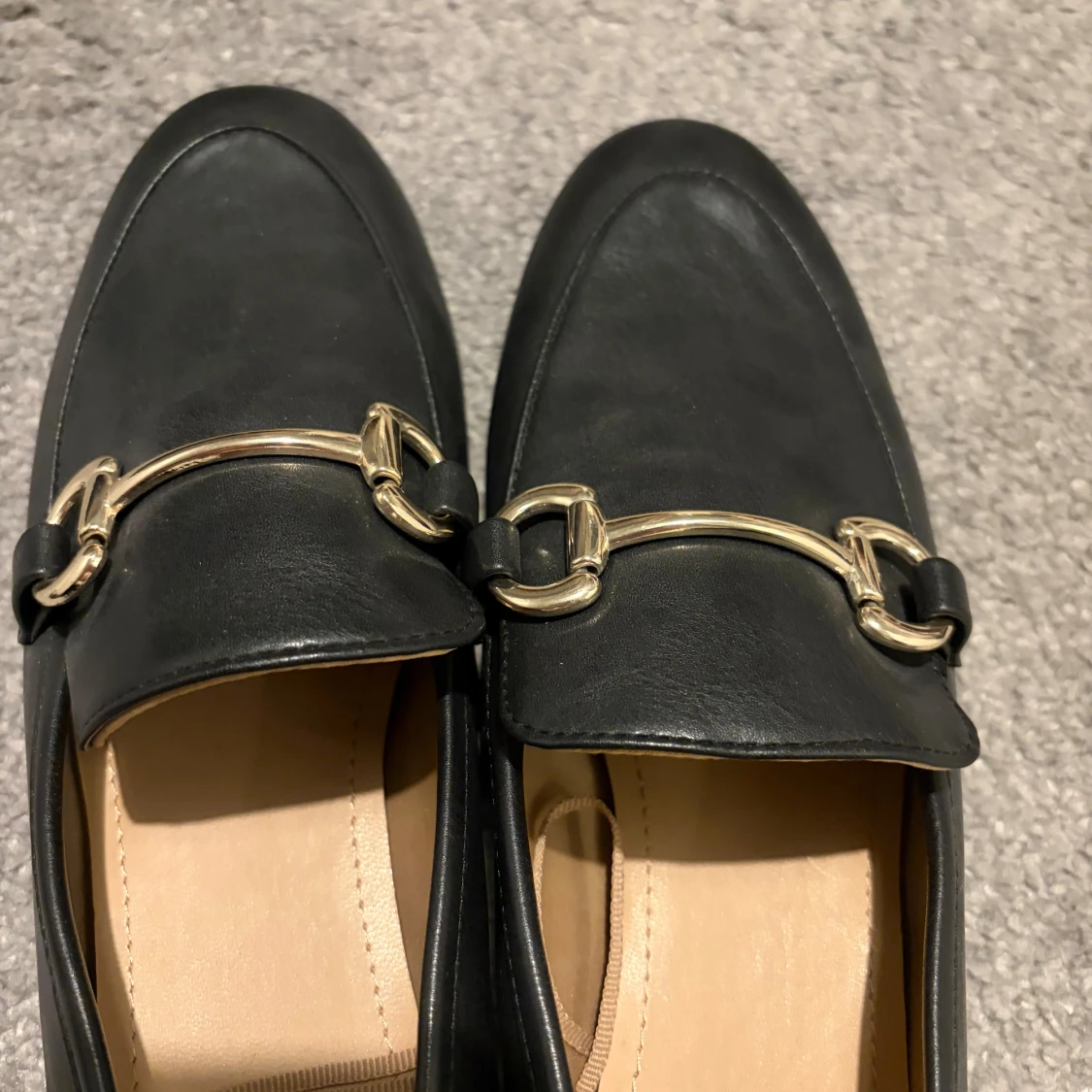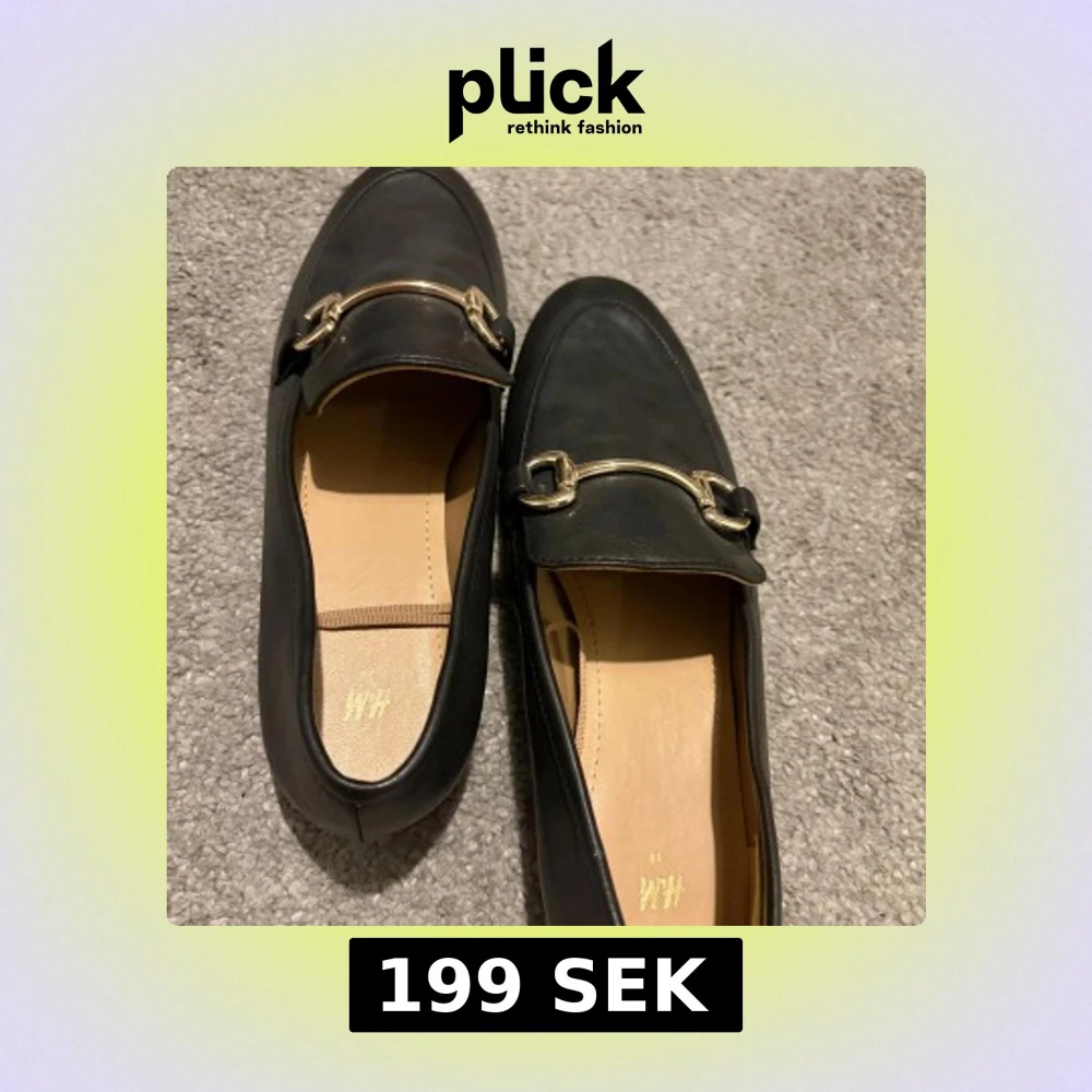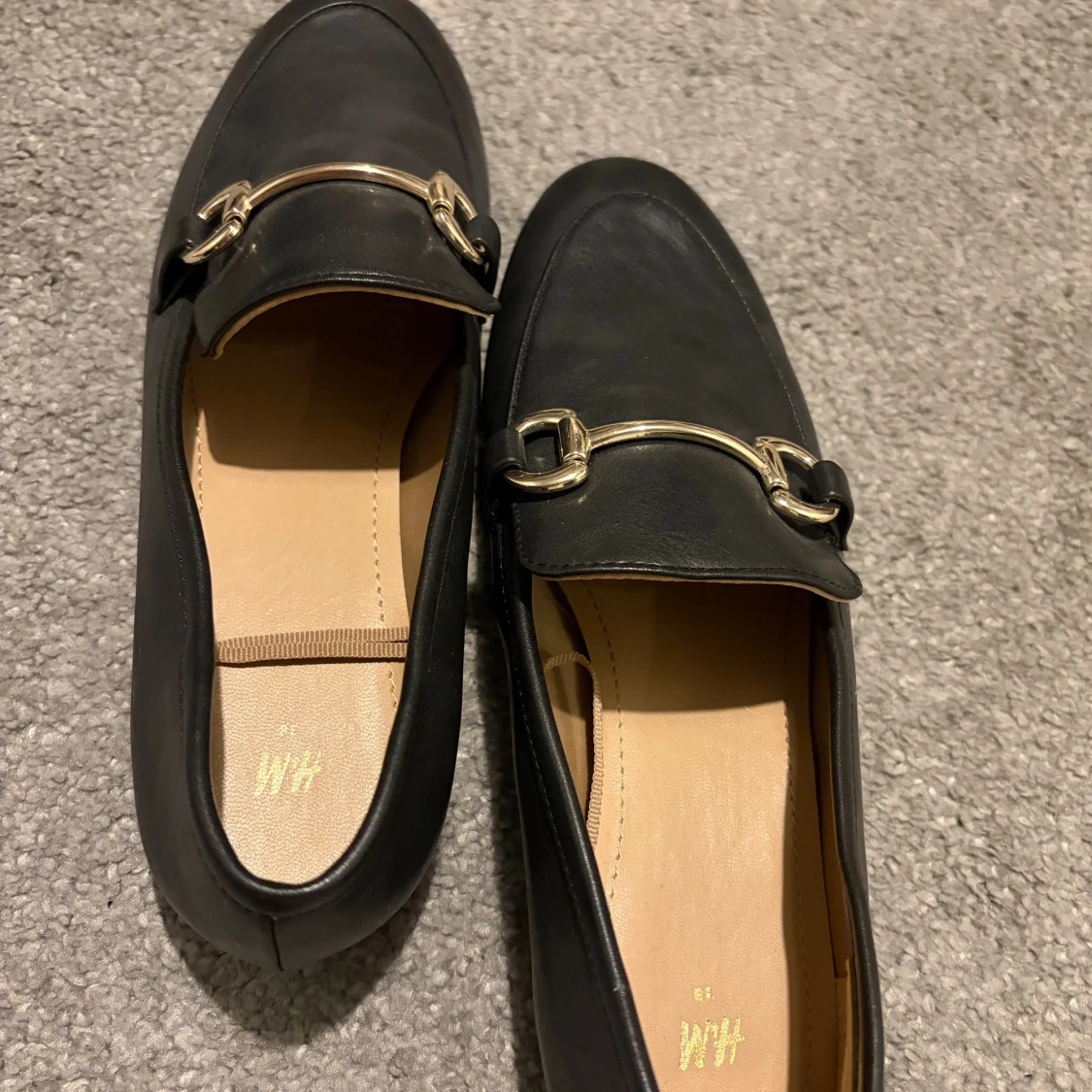 Stilrena svarta loafers från H&M med snygg guldfärgad metallspänne över foten. Skorna har en klassisk rund tå och är gjorda i ett slätt syntetmaterial med beige innersula. Perfekta för en clean och trendig look.