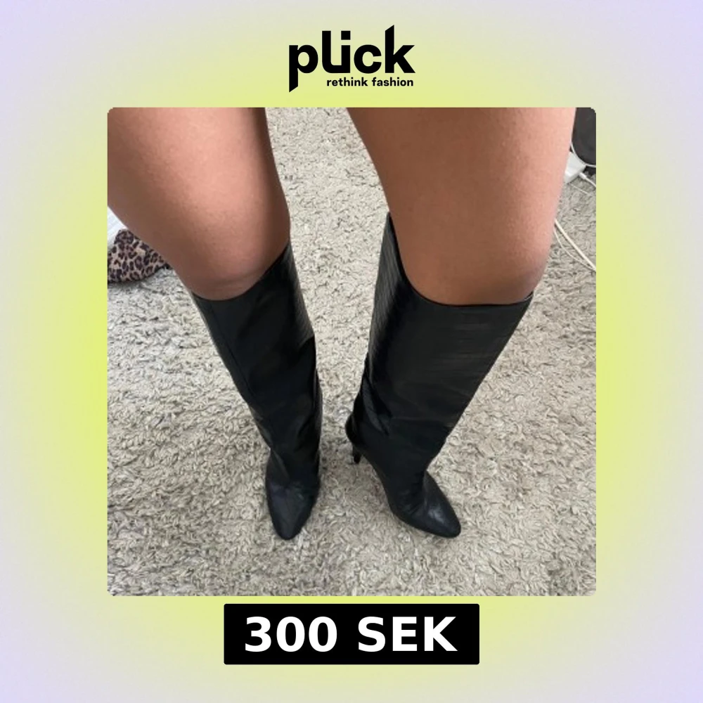 Säljer ett par svarta stövlar med klack och snyggt krokodilpräglat mönster. Stövlarna har spetsig tå och är tillverkade i syntetmaterial med glansig finish. Perfekta att styla till klänning eller kjol för en trendig look.