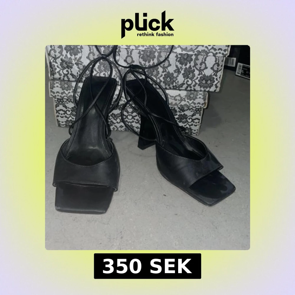 Svarta sandaler från H&M med fyrkantig tå, bred rem över foten och höga blockklackar. Skorna har tunna snören som lindas runt vristen för en trendig look. Tillverkade i syntetmaterial med stilren design som passar perfekt till sommarens outfits.