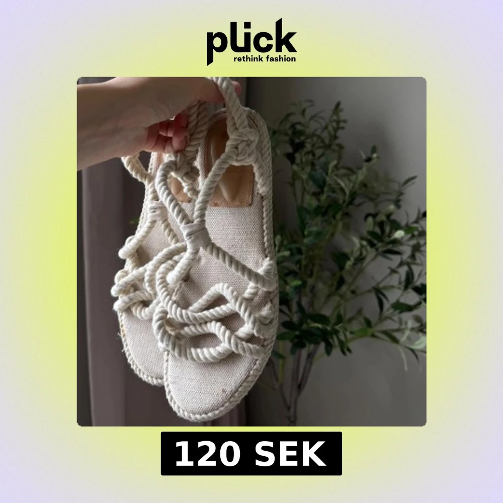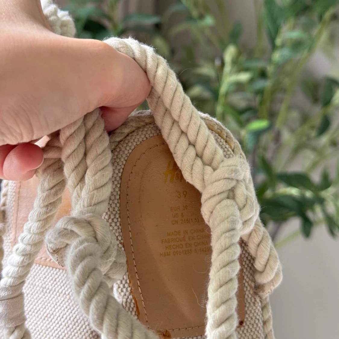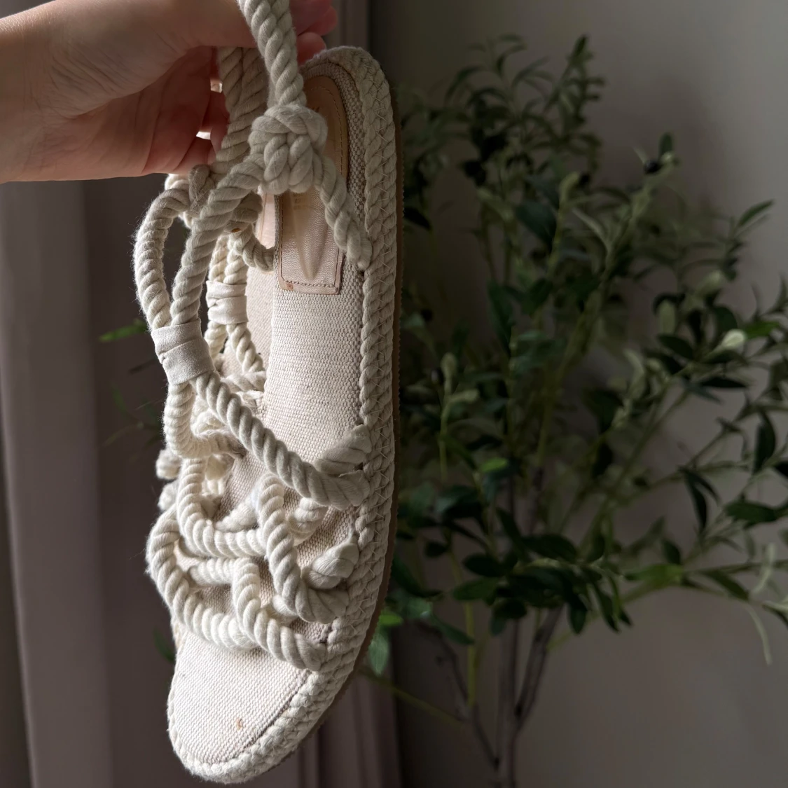 Unika sandaler från H&M i storlek 39, tillverkade i beige canvas och med grova repdetaljer som ger en cool boho-vibe. Platt sula och öppen tå, perfekta för varma dagar. Snygga att styla med både shorts och klänning.