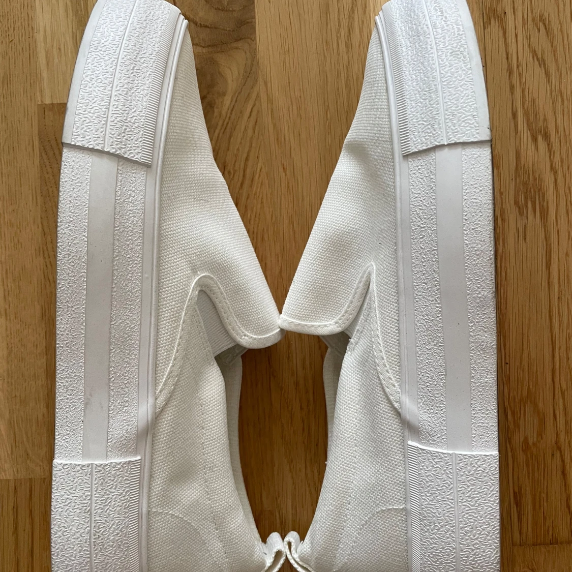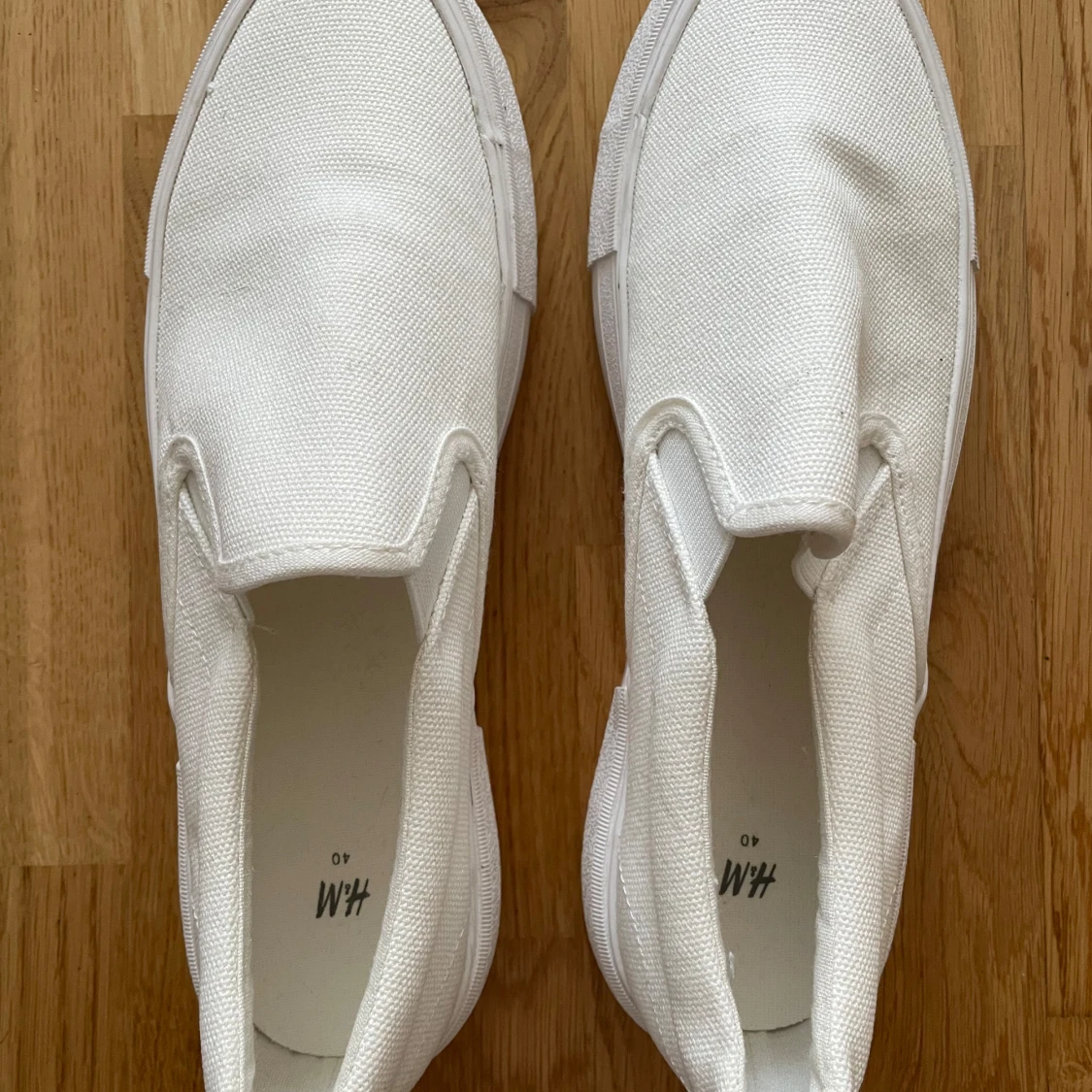 Säljer ett par klassiska vita slip-on sneakers från H&M i storlek 40. Skorna har en platt sula och är tillverkade i canvasmaterial. De har vaderad kant, resår i sidorna och hälla bak. Foder och innersula i bomullscanvas. Använda en gång och är i mycket fint skick.