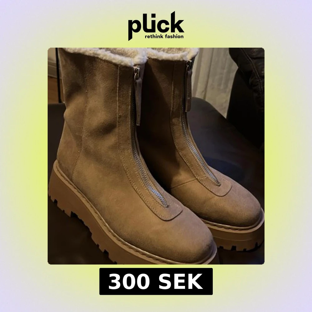 Snygga beige boots med grov platt sula och rund tå. Utsidan är i mocka och insidan har ett fluffigt vitt foder som håller dig varm. Dragkedja framtill gör dem enkla att ta på. Perfekta för kalla dagar och ger en cool look till din outfit.
