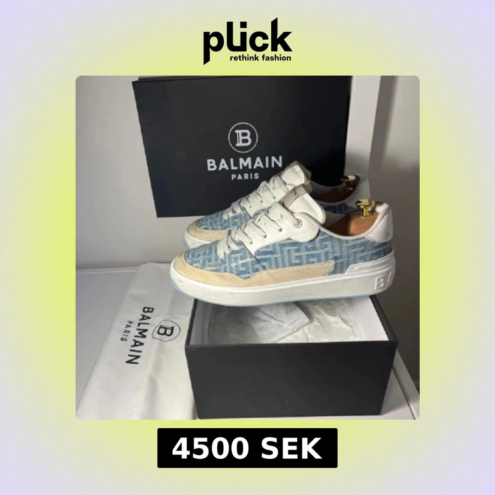 Snygga Balmain sneakers i blått och vitt med mönstrad textil och detaljer i mocka och skinn. Platt sula med Balmain-logga undertill, snörning och rund tå. Perfekt för dig som gillar exklusiv streetstyle och vill sticka ut med ett lyxigt märke.