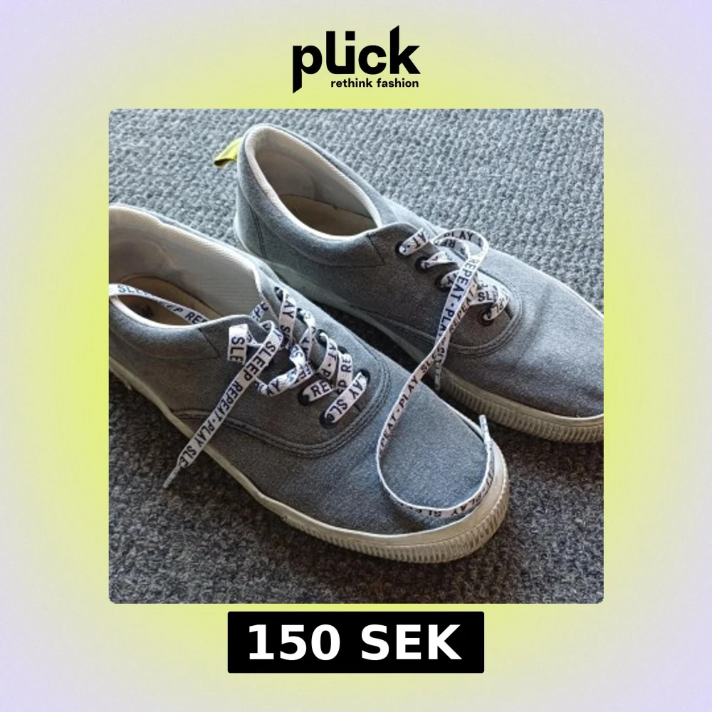 Grå sneakers i canvas med vita sulor och snörning. Skosnörena är vita med svart text 'SLEEP PLAY REPEAT' tryckt längs hela snöret. Skorna har rund tå och en klassisk, enkel design som passar till det mesta.