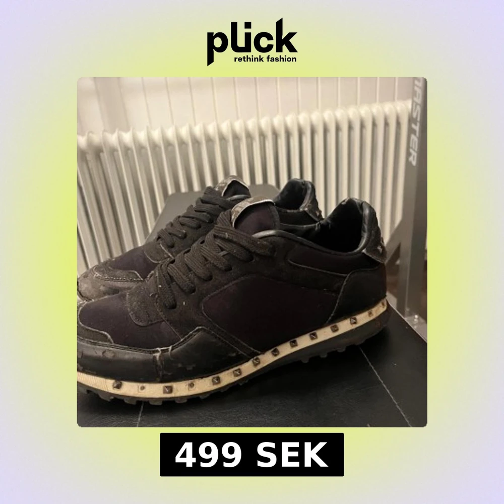 Svarta Rockrunner med coola silverfärgade nitar runt sula och häl. Skorna har snörning, platt sula och rund tå. Materialmix av mocka och textil ger en schysst kontrast. Perfekt för dig som gillar edgy designerstil. Skick 6,5/10