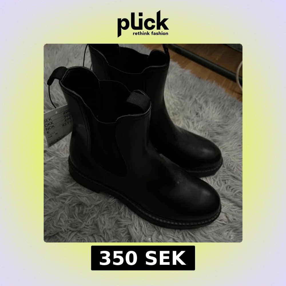 Säljer ett par svarta chelsea boots med elastiska paneler på sidorna och dragflikar fram och bak. Skorna har en rund tå och platt sula, perfekta för en stilren look. Helt oanvända och prislappen kvar, tyvärr inte originalförpackningen.