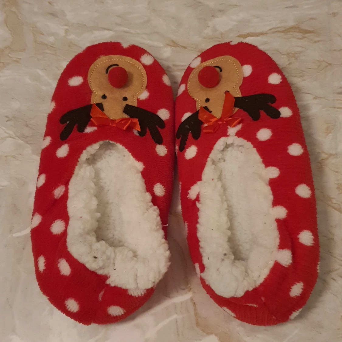 Röda jul tofflor med renar på, aldrig använda pågående av att de varit för små då ja har 39 i skostorlek