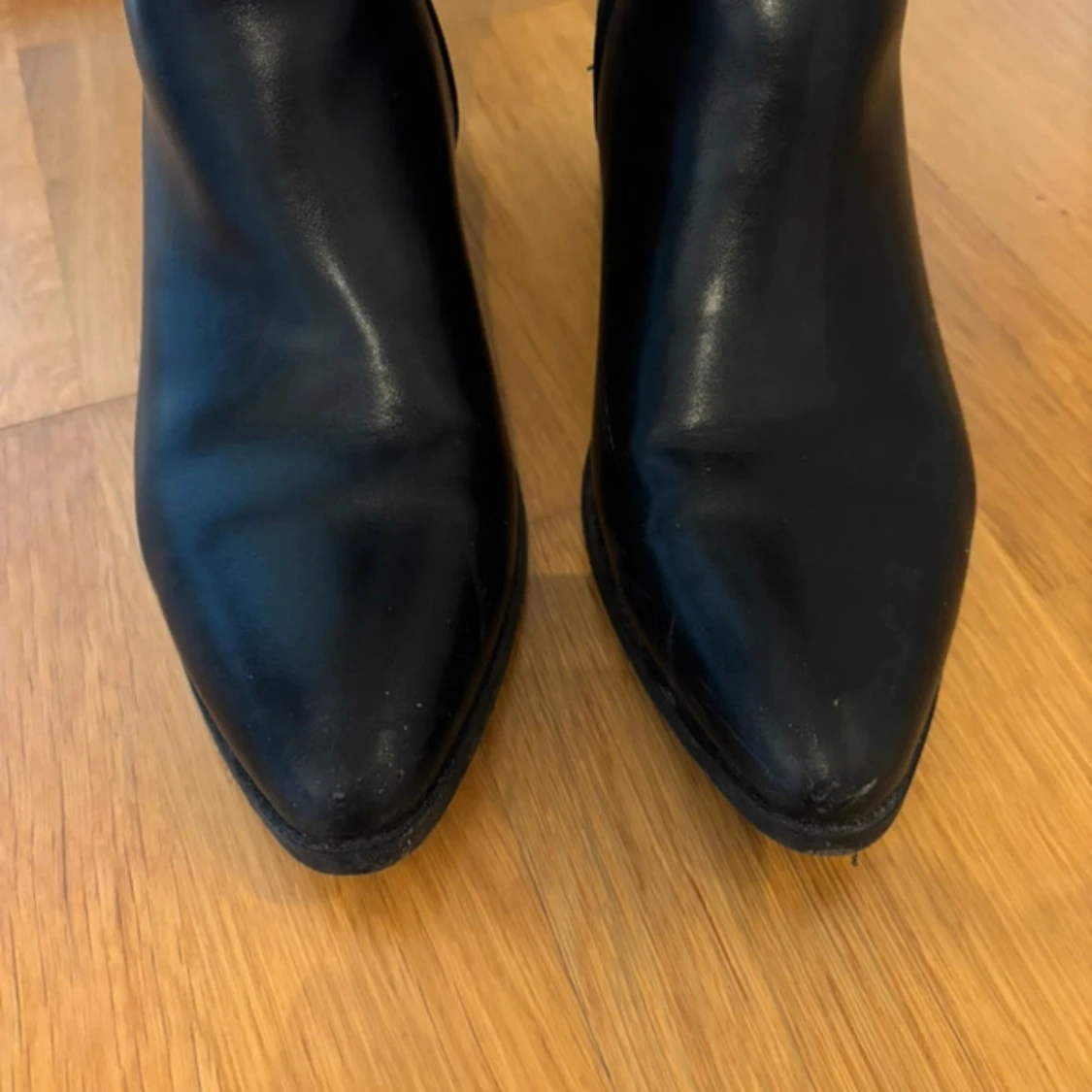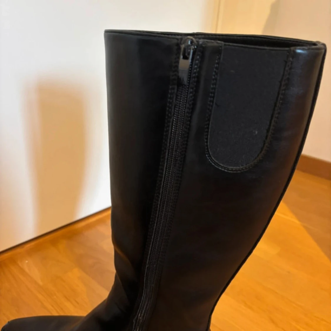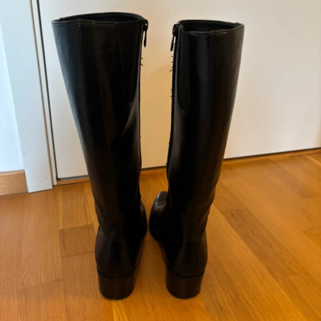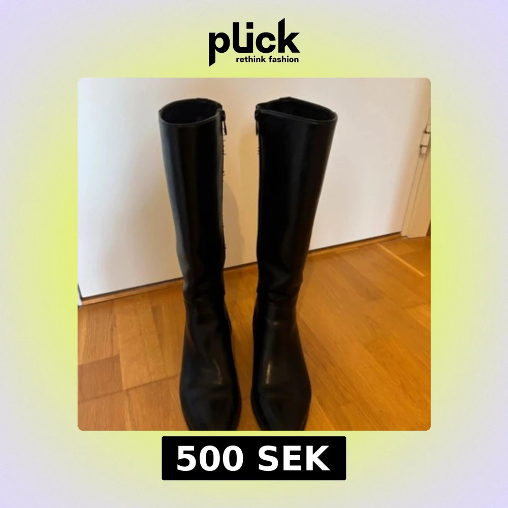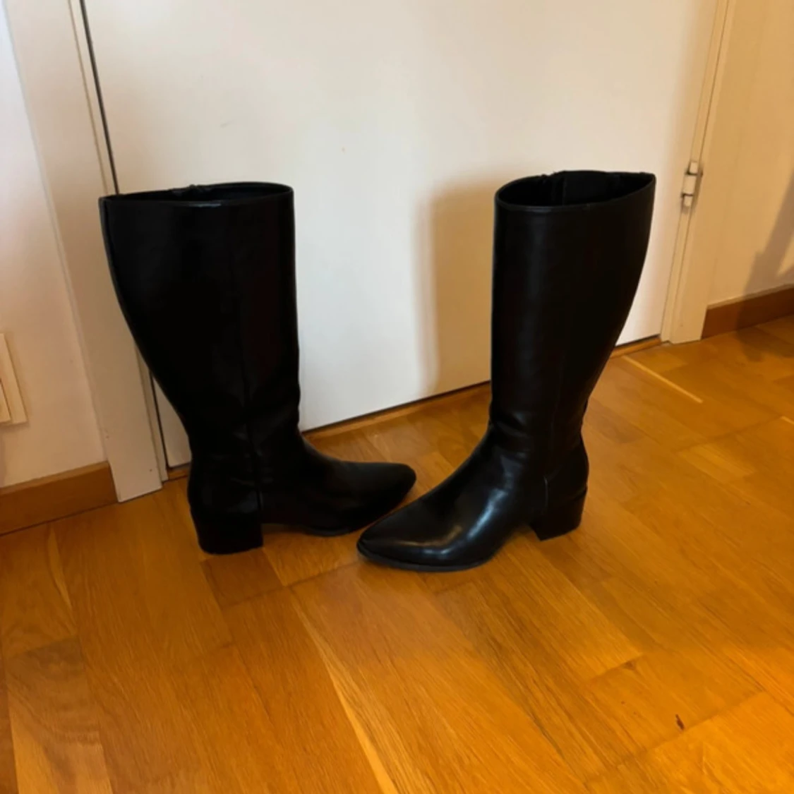 Snygga svarta stövlar i skinnimitation med spetsig tå och låg klack. Stövlarna har dragkedja på insidan och en klassisk, stilren look som passar perfekt till både jeans och kjol. De är höga och går upp till knäet för en trendig siluett. Använda fyra gånger, fint skick men något slitna vid spetsen, men inget man lägger märke till, lite trådar står ut vid dragkedjan, heller inget man lägger märke till. Nypris 699kr