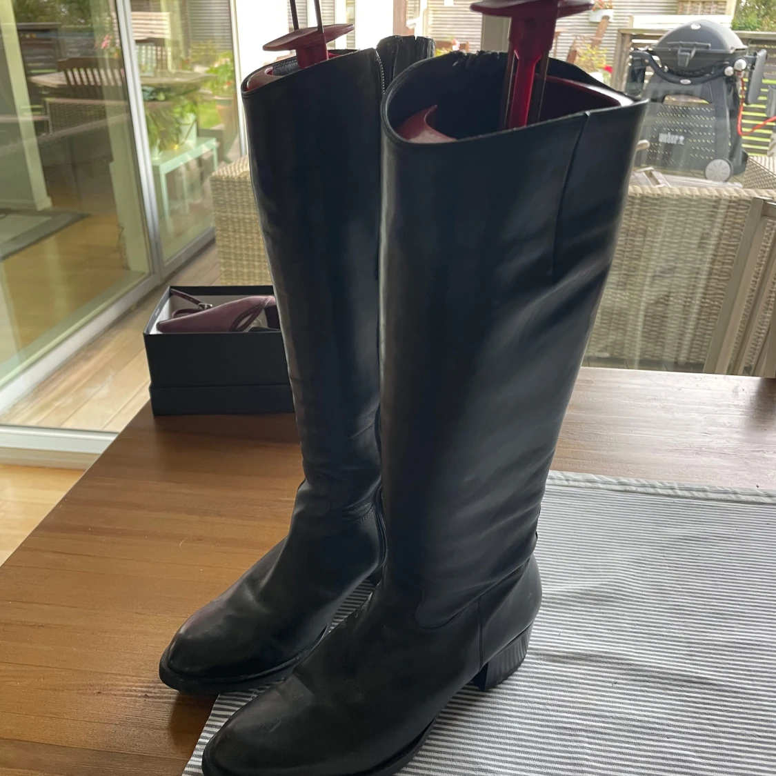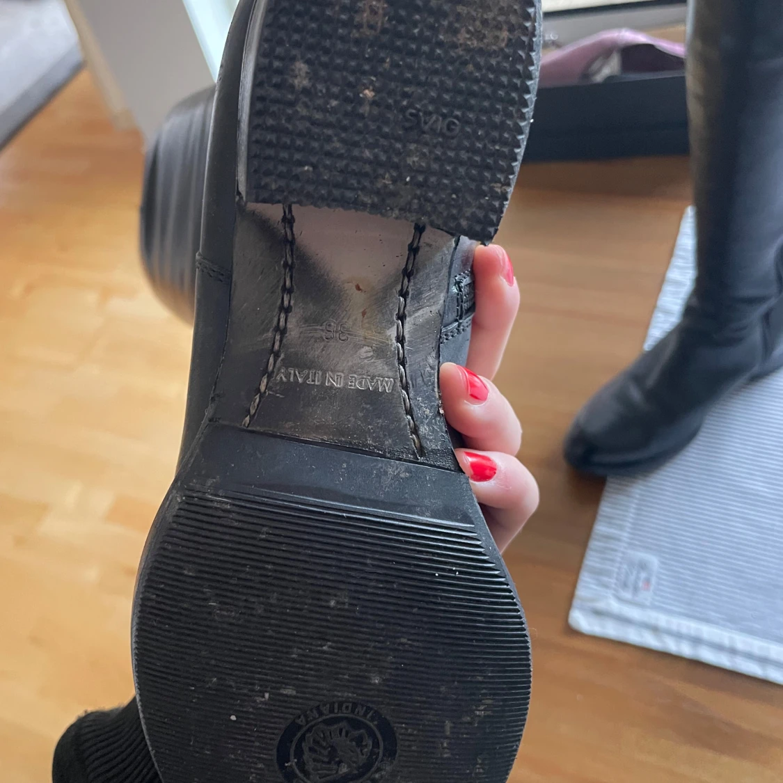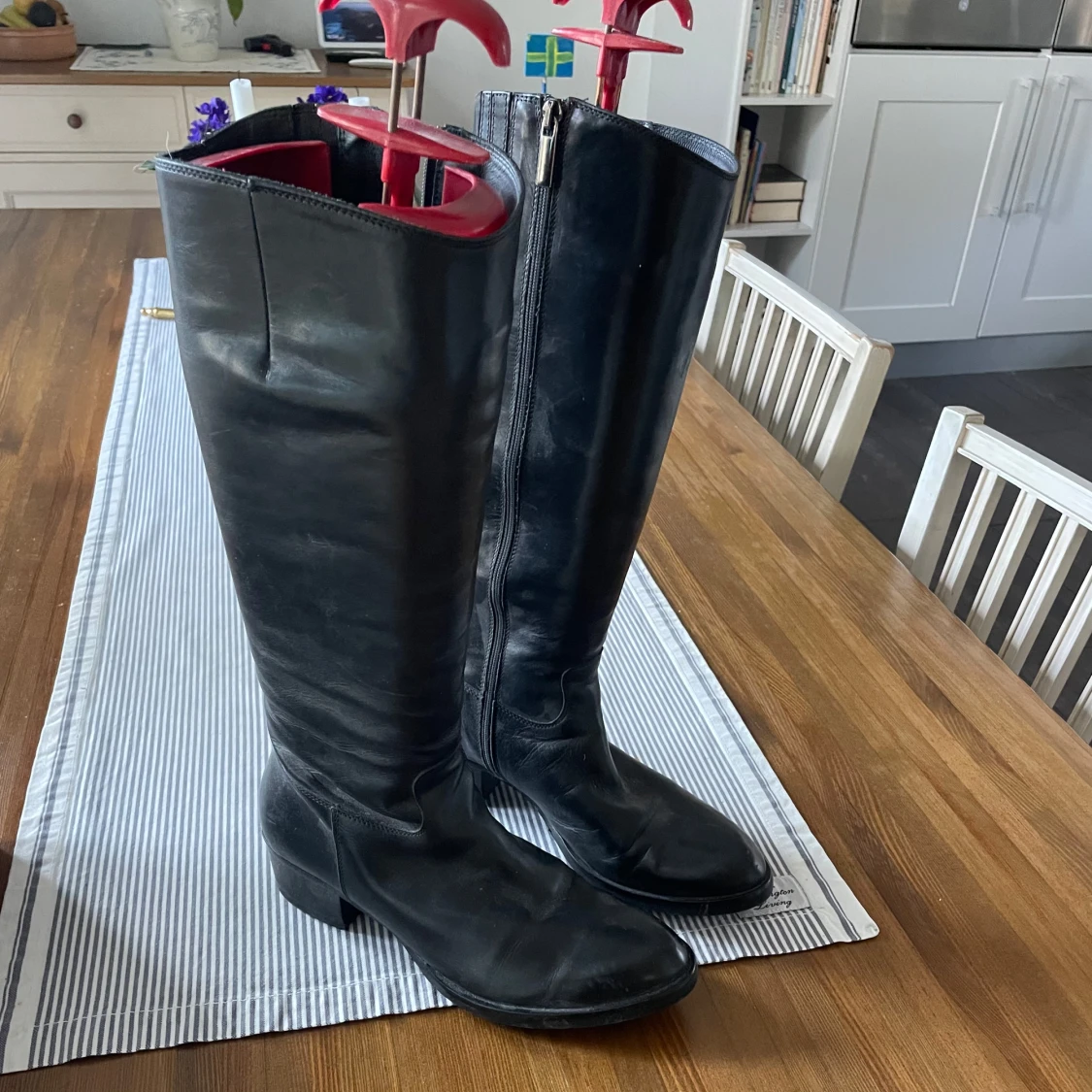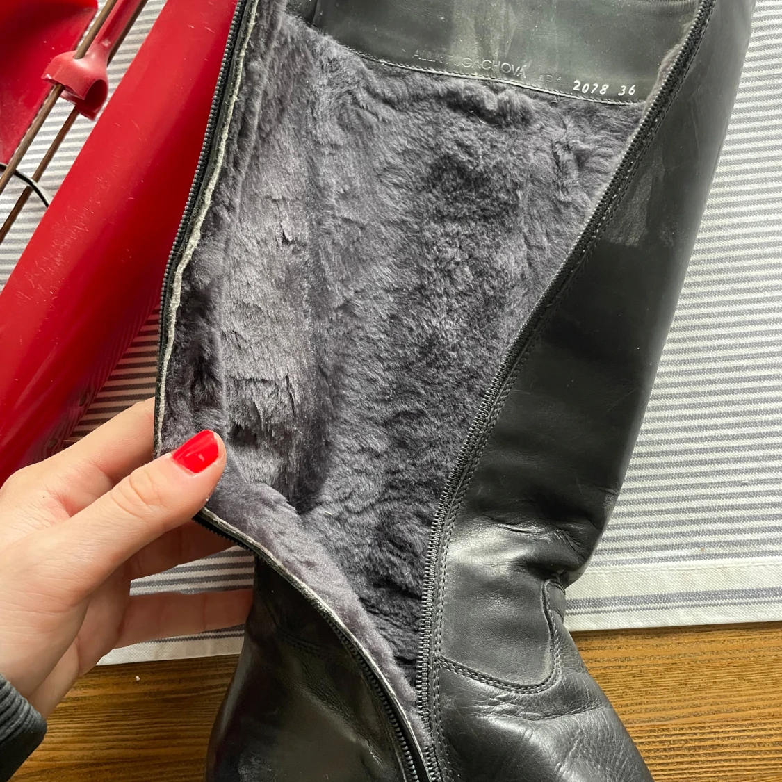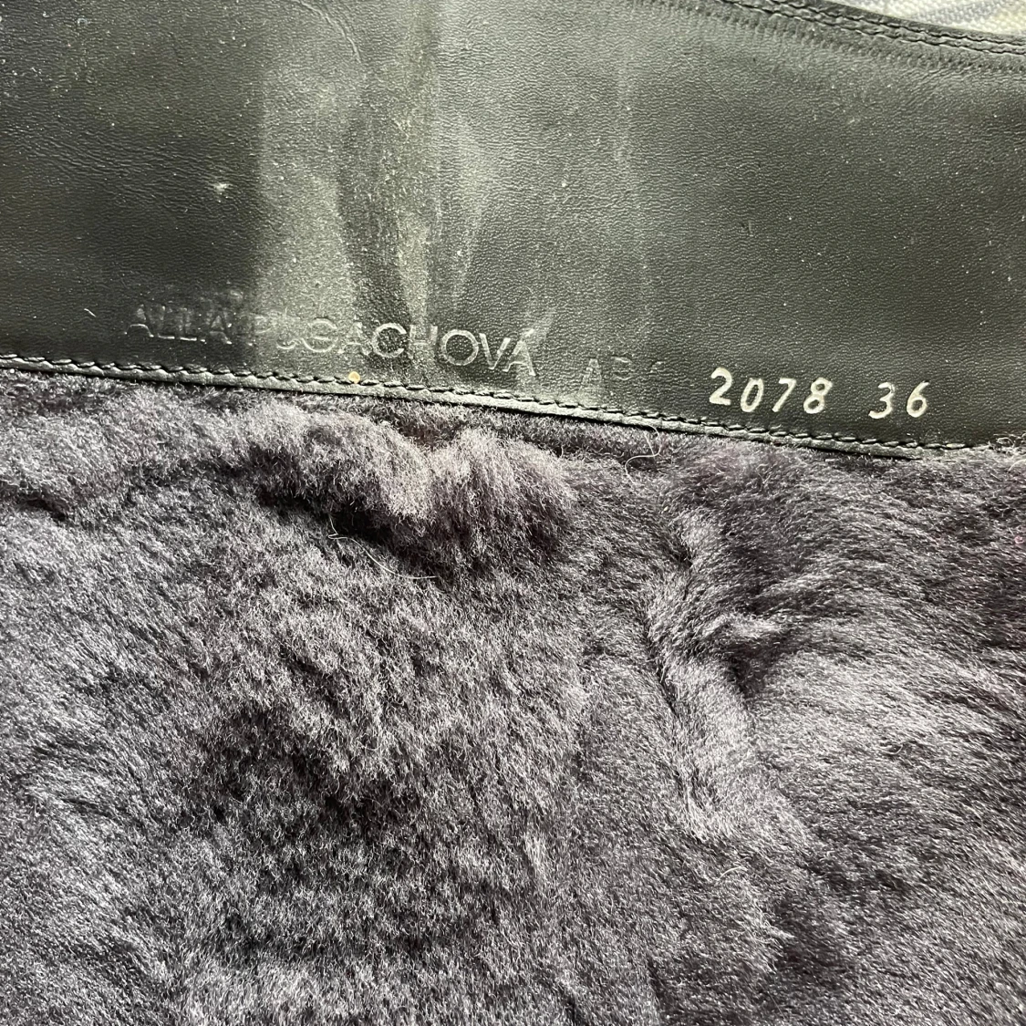 Säljer ett par svarta höga stövlar från Alla Pugachova, tillverkade i Italien. Stövlarna har en rund tå, låg klack och dragkedja på sidan. Utsidan är i slätt skinn och insidan är fodrad med mjuk päls för extra värme. Perfekt för dig som vill ha en klassisk och stilren look.