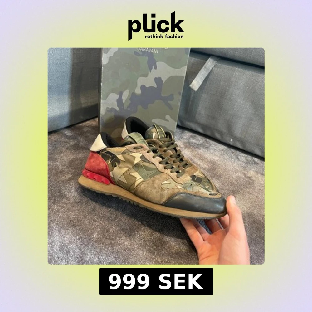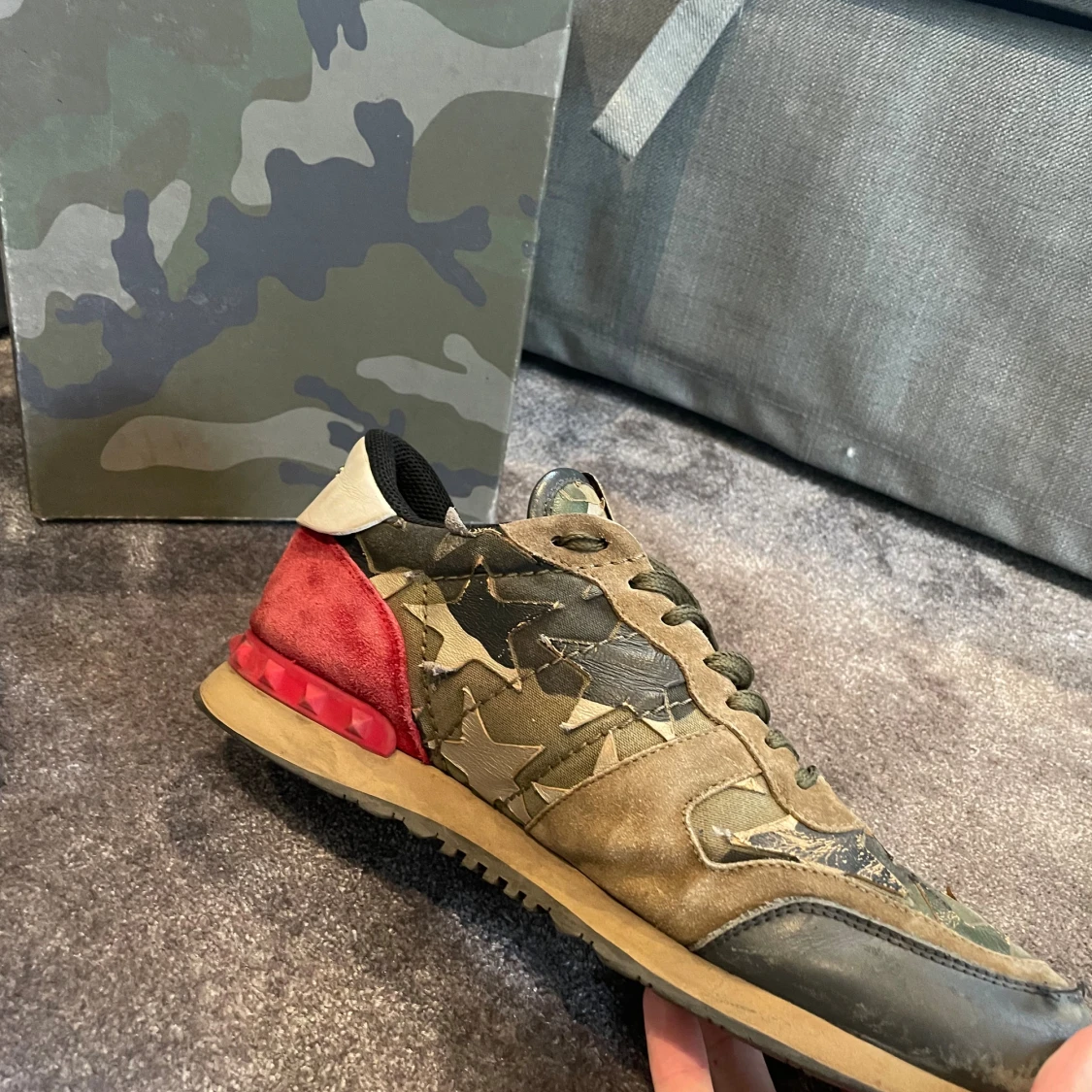 Snygga Valentino Rockrunner sneakers med camouflagemönster i grönt, beige och svart, samt röda och vita detaljer vid hälen. Skorna har snörning, platt sula och rund tå. Storleken är 43 och boxen ingår! Skorna är i använt men bra skick! Nypris är runt 6000kr. Vid fler frågor är det bara att höra av er!