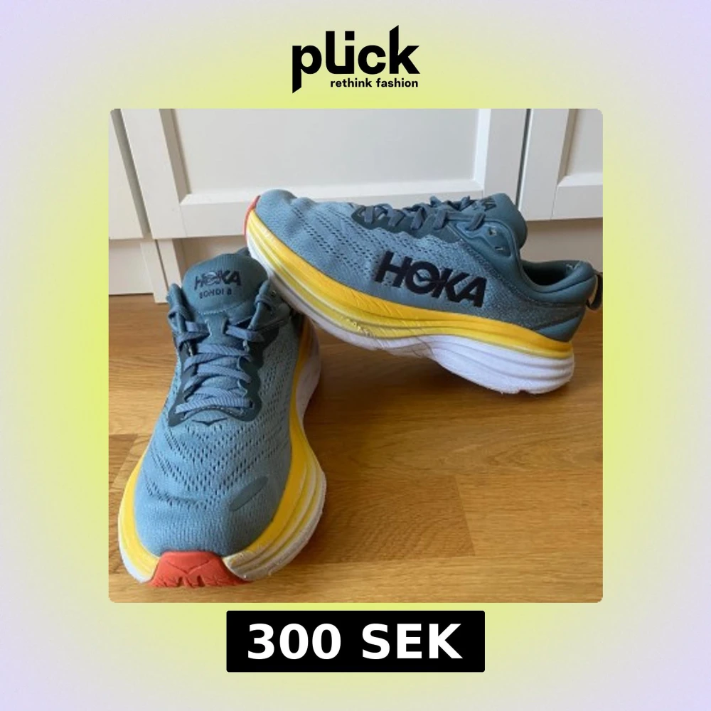 Säljer ett par Hoka Bondi 8 löparskor i en snygg kombination av blått, gult och rött. Skorna har en tjock sula för extra dämpning och komfort. Perfekta för långa löprundor med bra stöd och stabilitet.