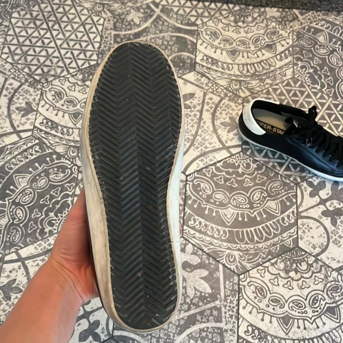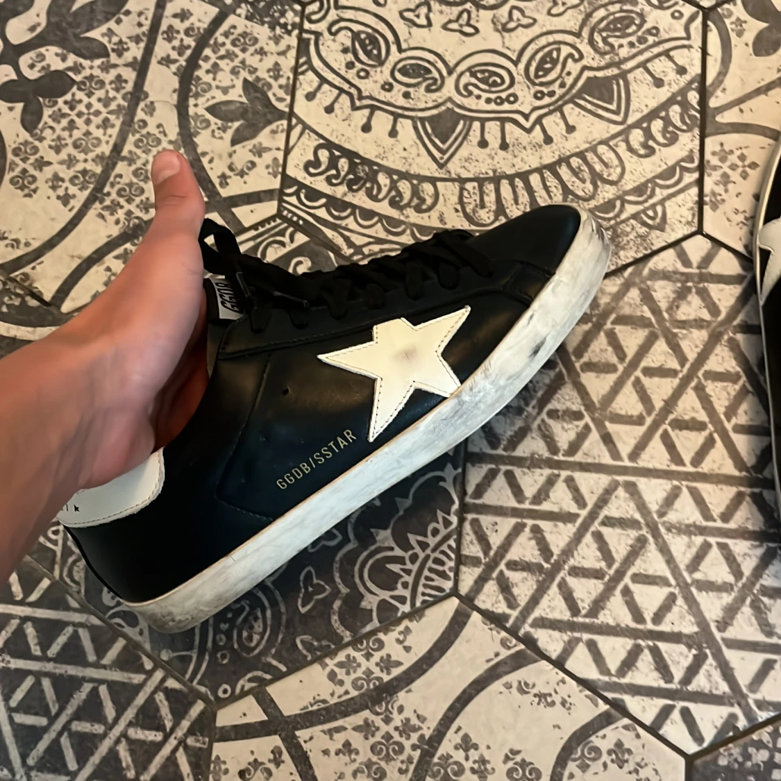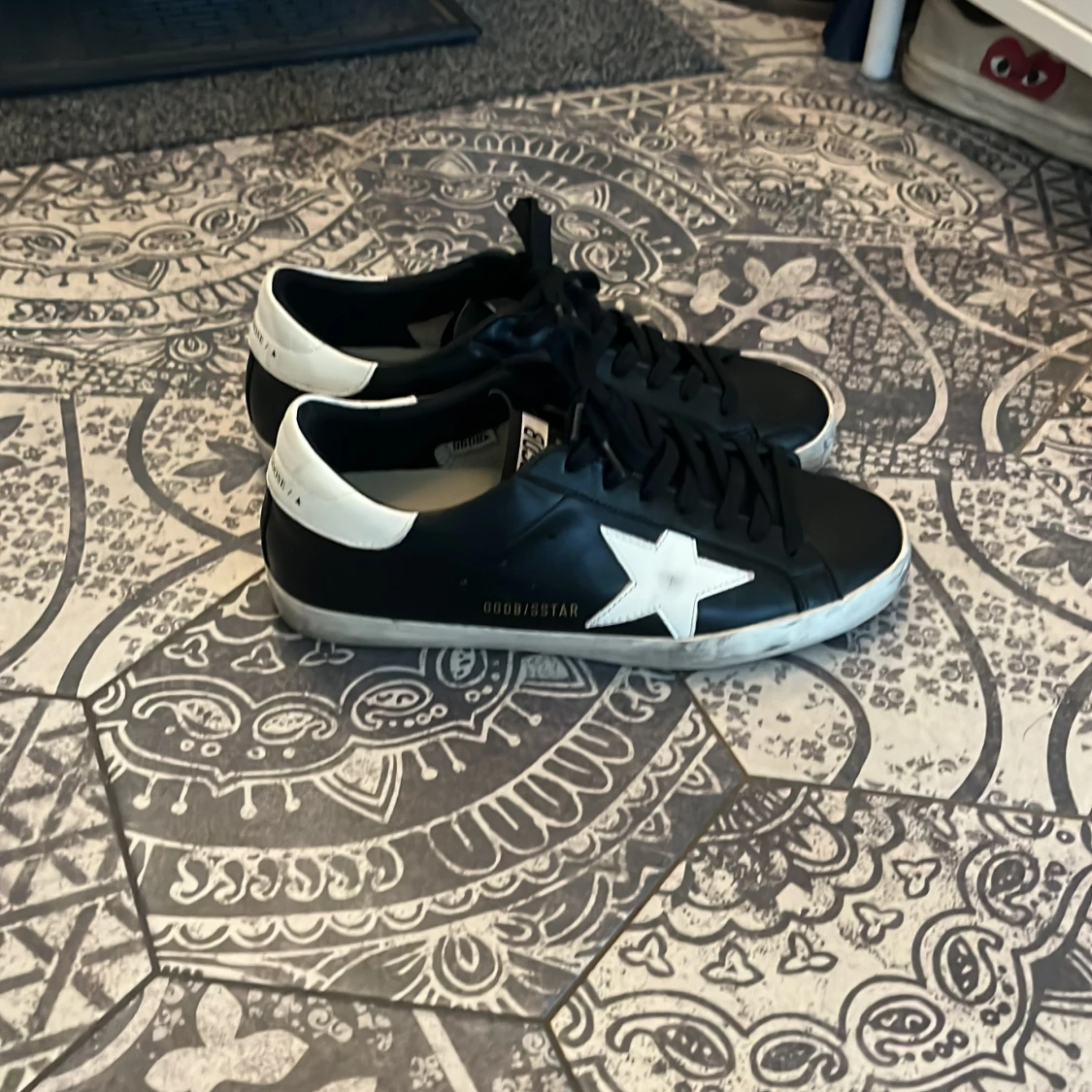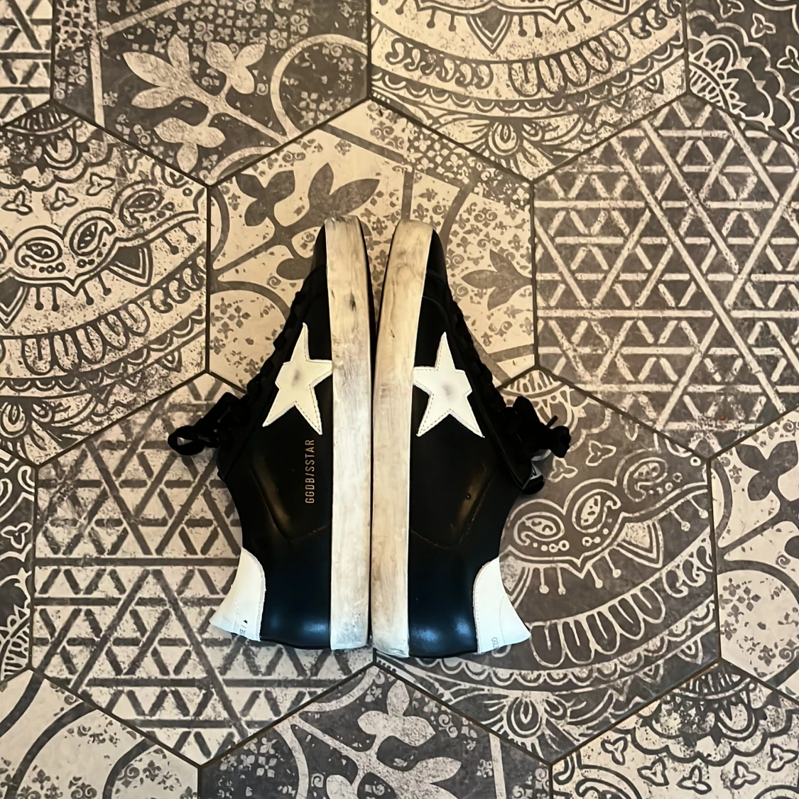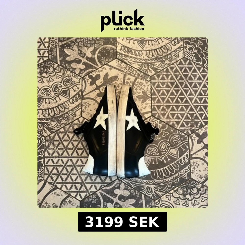 Svarta sneakers från Golden Goose med vit stjärna på sidan och vit häl. Skorna har svarta skosnören, vit sula med slitna detaljer. Tillverkade i skinn och har en klassisk låg profil. Denna sko kommer vara perfekt under vinterns eftersom den är svart och inte blir så smutsig. Köpte dessa skor från en kompis.