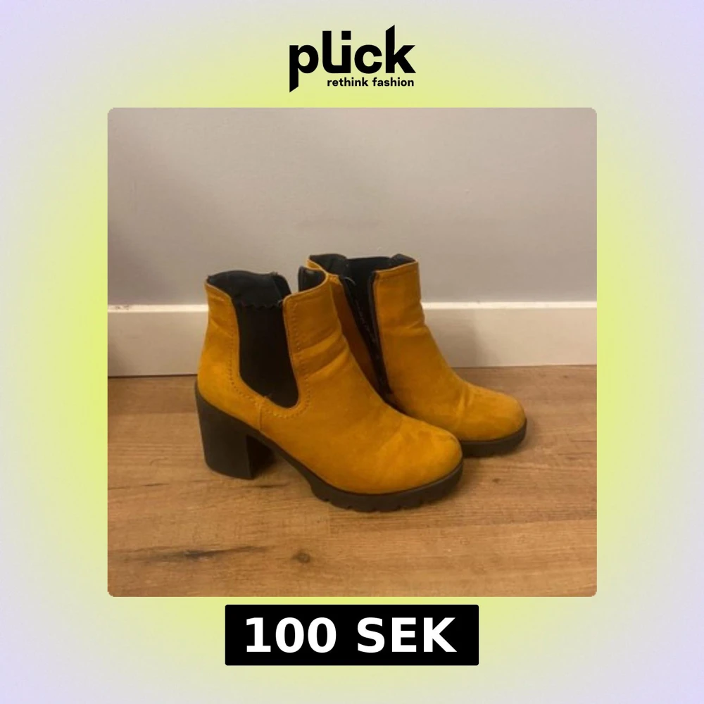 Gula kängor med klack. Klacken är ca 8 cm hög