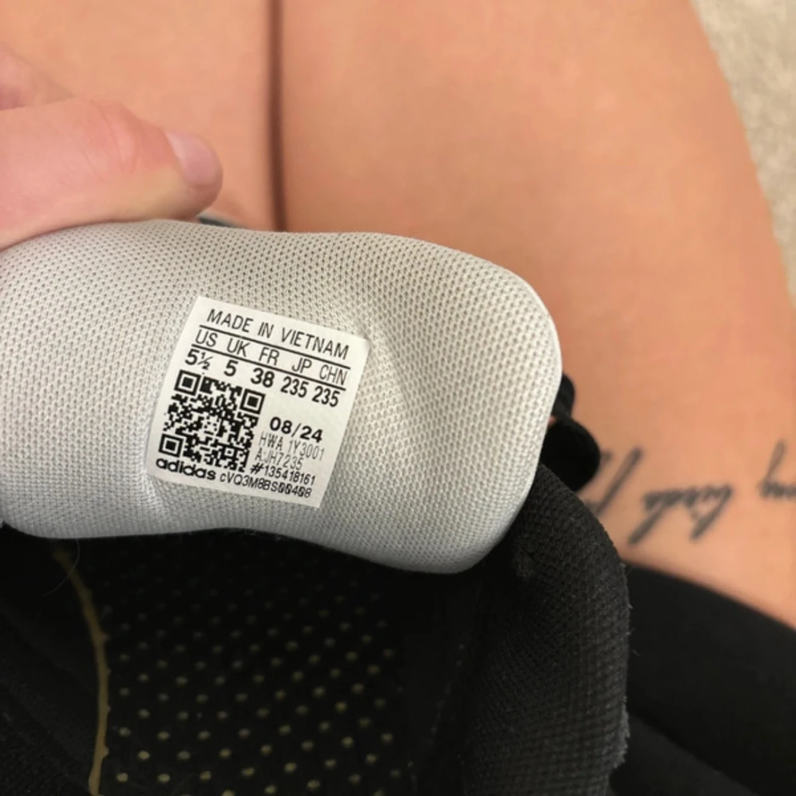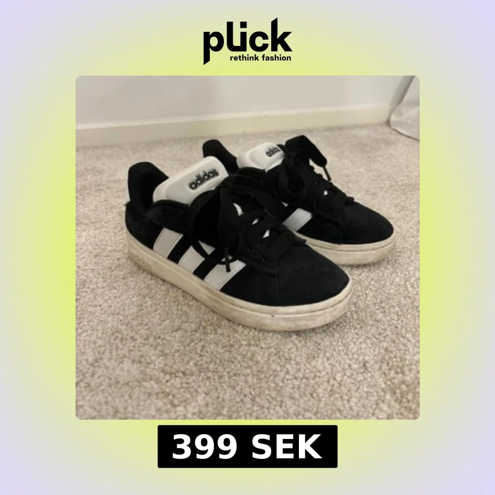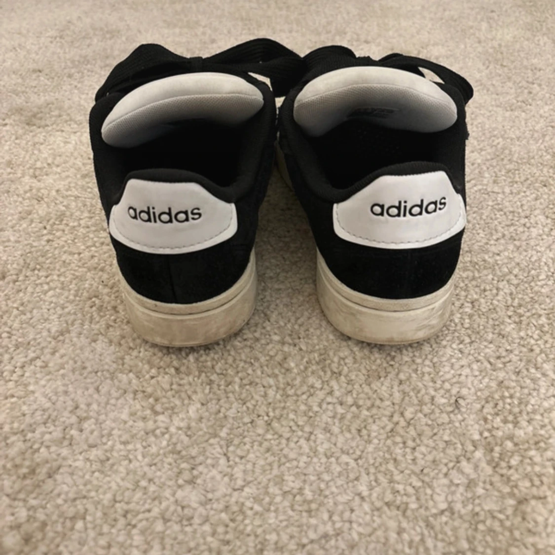 Klassiska svarta Adidas sneakers med vita detaljer och de ikoniska tre ränderna på sidorna. Skorna har snörning, vit platt sula och är tillverkade i mocka och syntet. Perfekta för en sportig och stilren look.