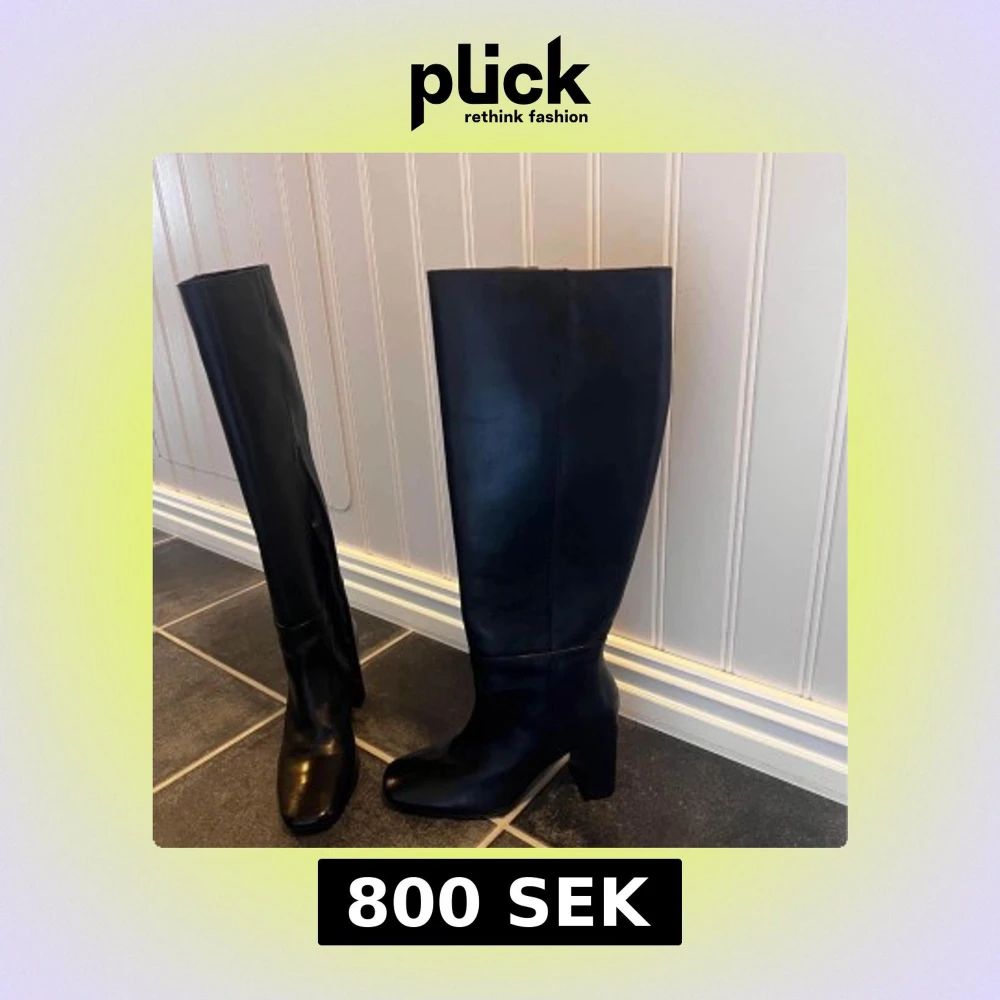 Snygga svarta knähöga stövlar i äkta skinn med 8cm hög blockformad klack. Helt oanvända och endast testade då de var för stora för mig. Nypris 1499kr säljer för 800kr men kan absolut ta emot andra bud