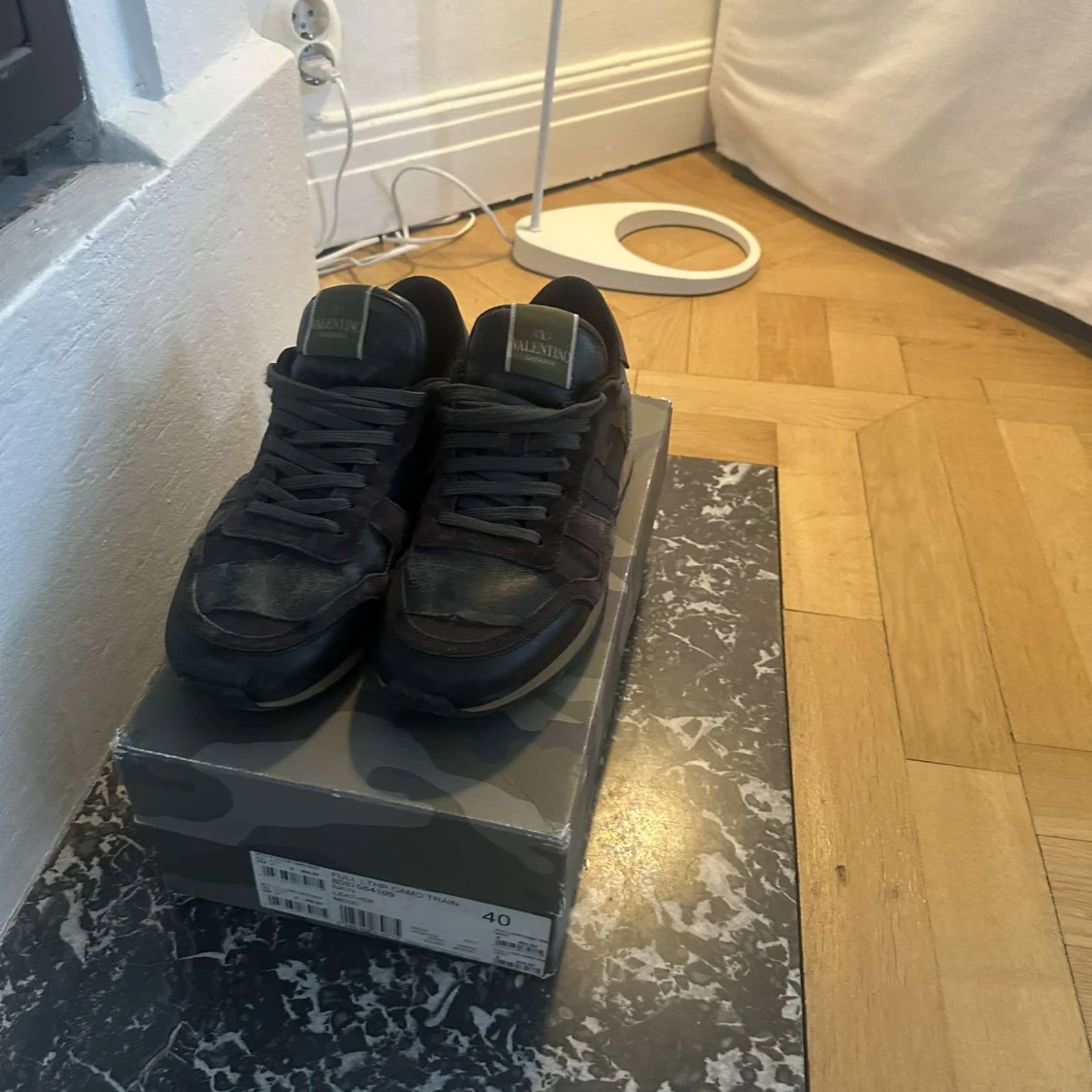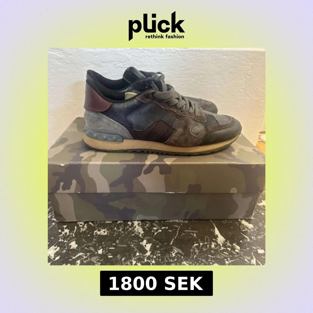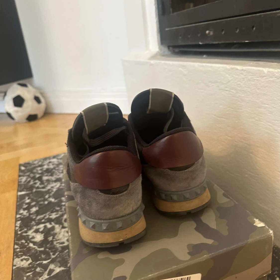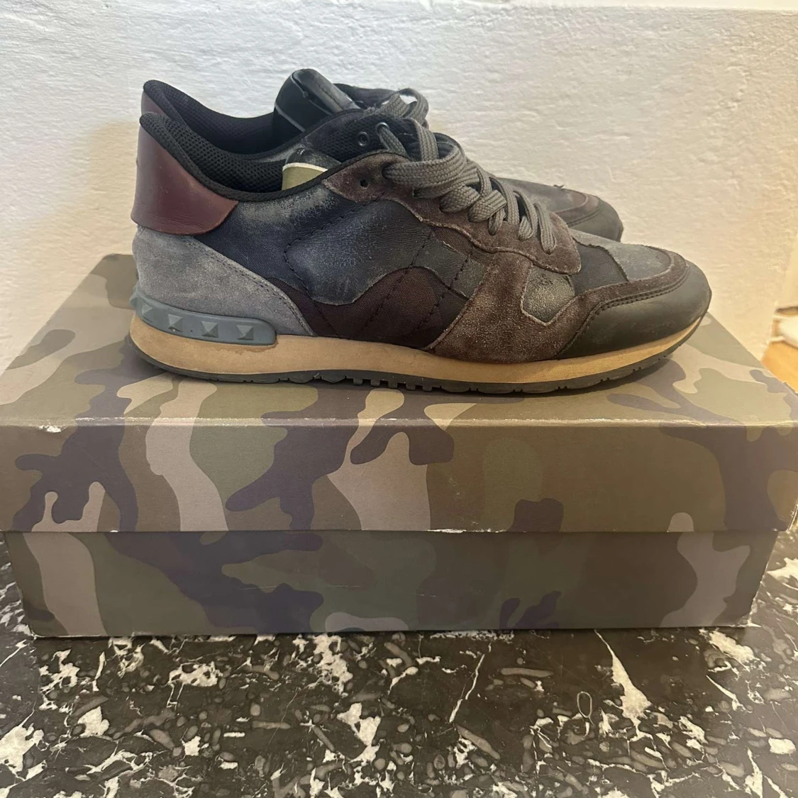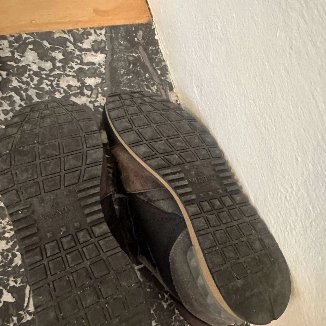 Snygga Valentino Rockrunner sneakers i mörkgrå och svarta toner med detaljer i vinrött och beige. Skorna har en cool camouflagemönstrad ovandel i mocka och skinn, samt ikoniska nitar på hälen. Perfekta för dig som vill sticka ut med exklusiva och trendiga sneakers.