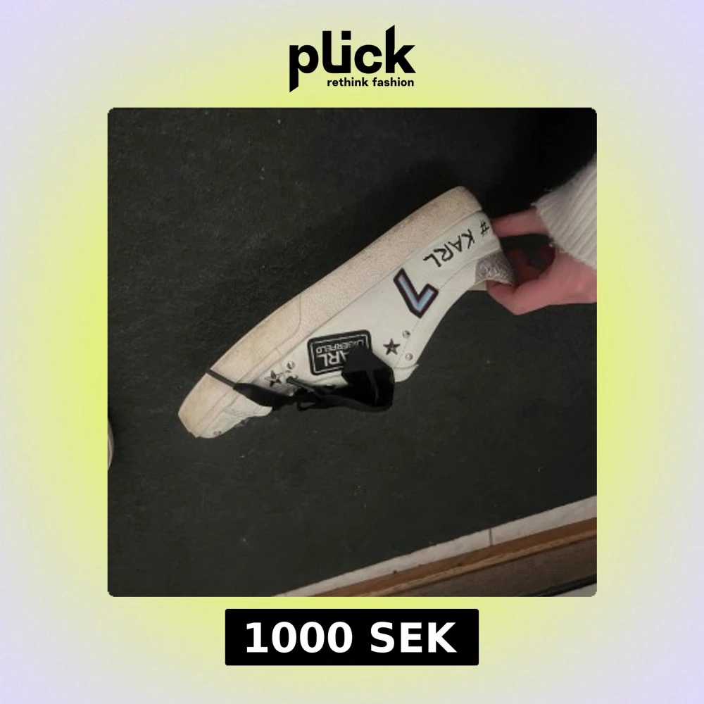 Unika vita sneakers från Karl Lagerfeld med svarta sammetsband, silvriga stjärnor och nitar på tån. Sidan pryds av tryck, broderier och textdetaljer. Storlek 38.
