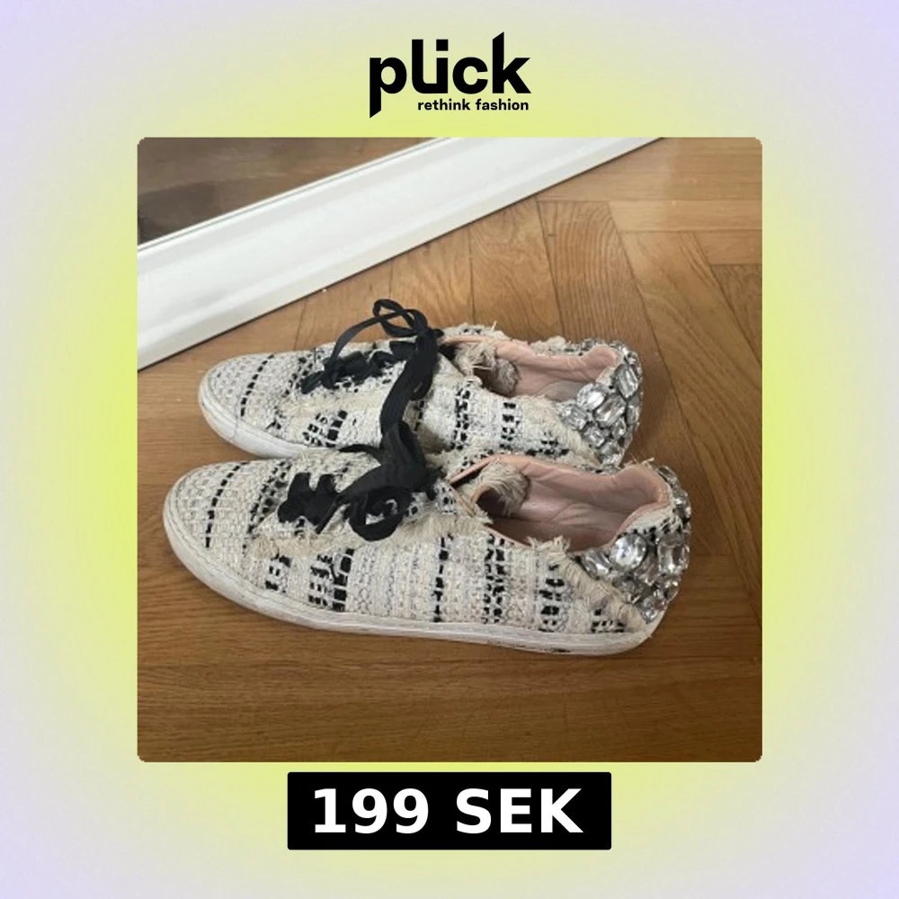 Så coola och unika sneakers från Zara i vit och svart tweed med fransiga detaljer och stora glittriga pärlor på hälen. Skorna har svarta snören och en rund tå💌💌💌💌