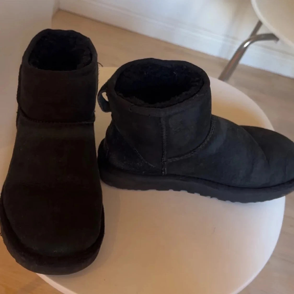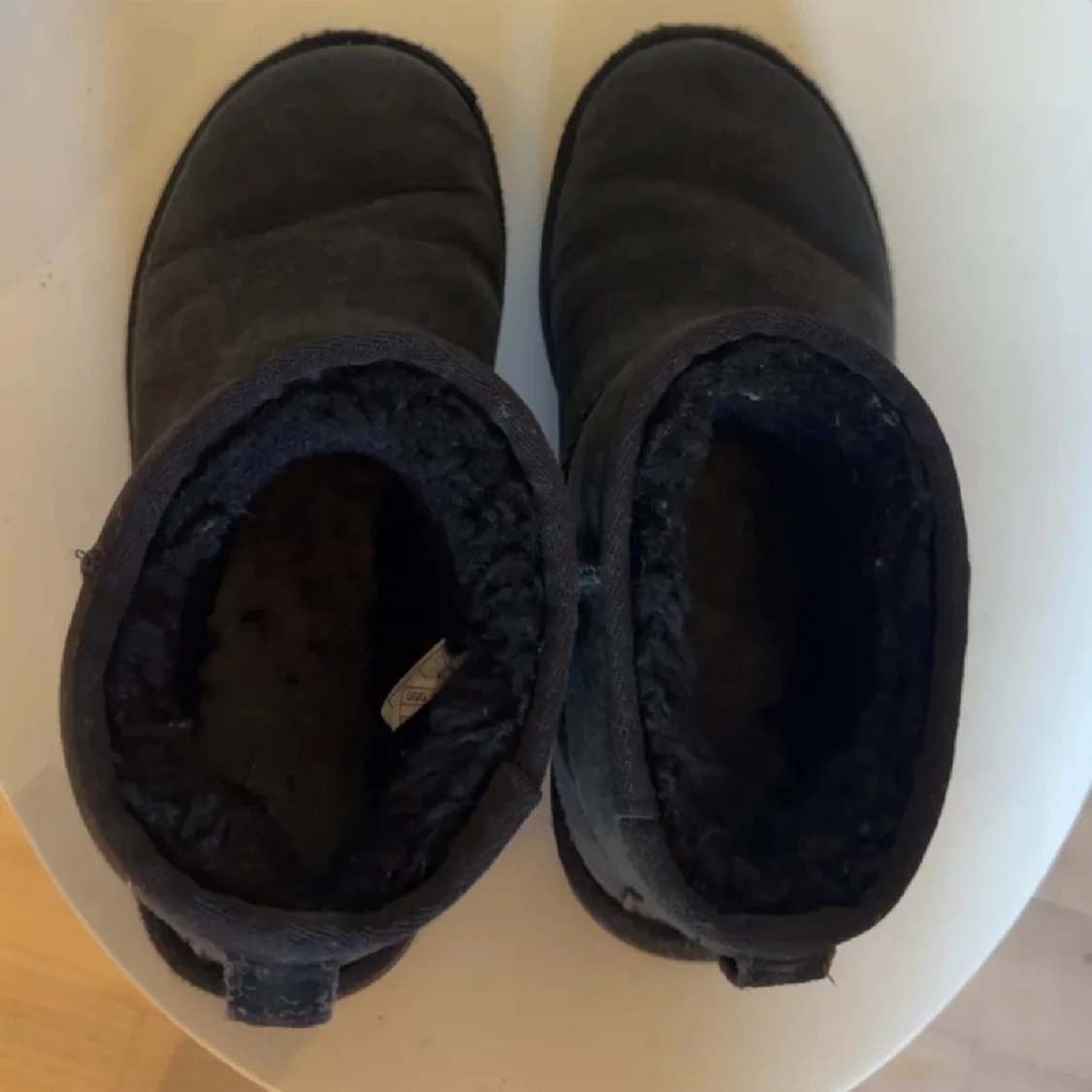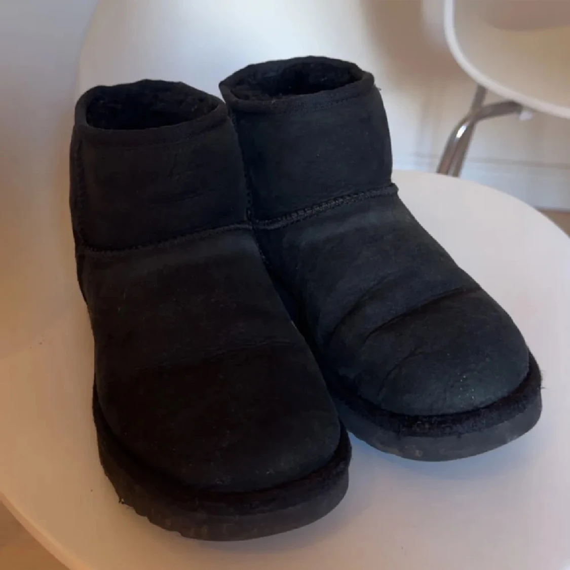 Säljer mina svarta UGGs i storlek 37, pga jag har använt dom mycket och ute i snö o regn har dom blivit slitna på yttersida samt uppslitna i båda hälarna (se bild 3), därav priset🖤🖤