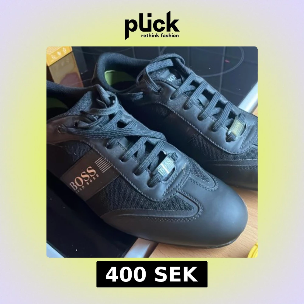 Snygga svarta sneakers från Hugo Boss med stilren design. Skorna har snörning och en diskret logga på sidan. Perfekta för en modern och avslappnad stil.